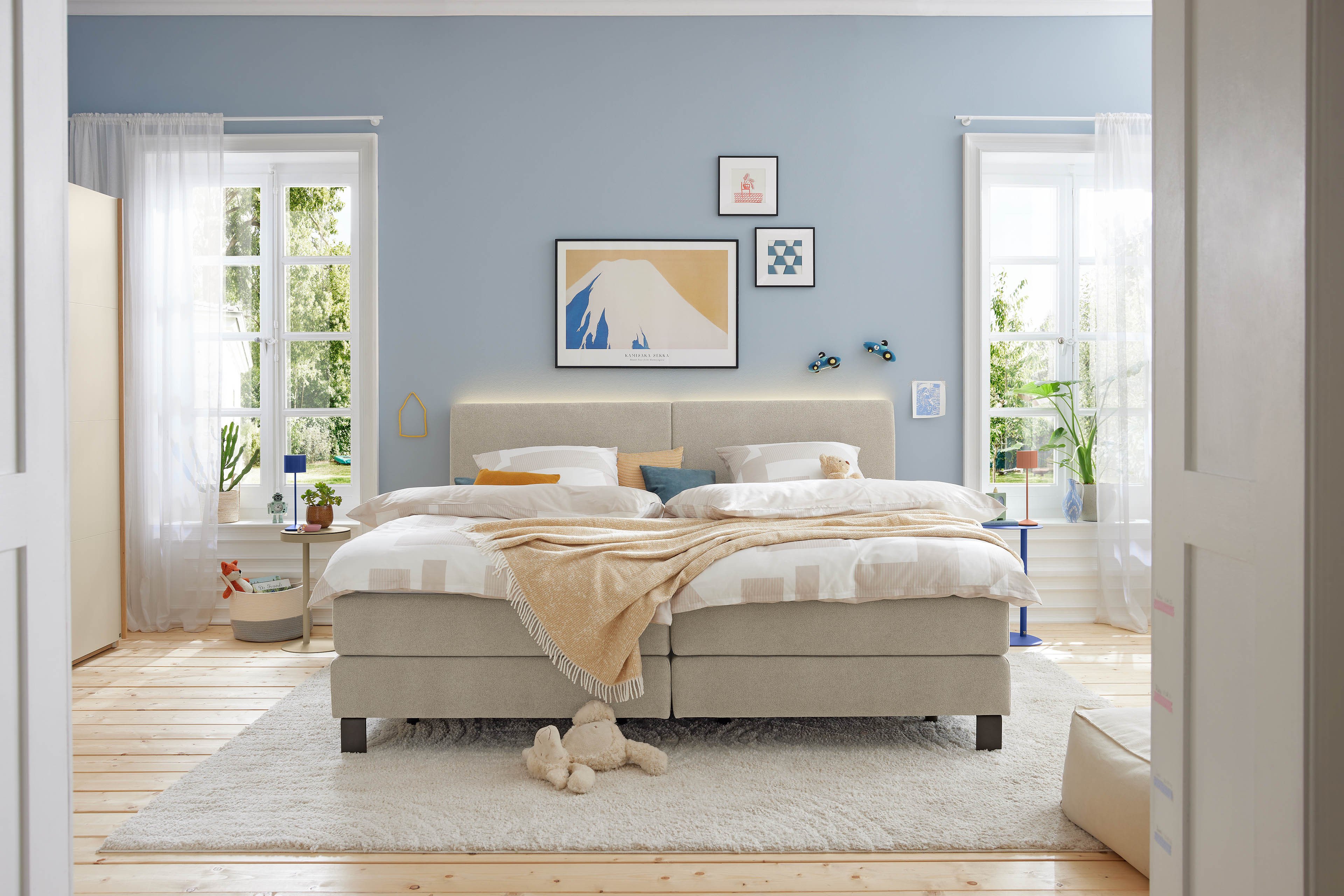 Endlich ist genug Platz für alle – auch für die kleinen Übernachtungsbesucher, die sich immer wieder zu Ihnen mit ins Bett schleichen. Das extra breite Familien-Boxspringbett Elias-Dream von Musterring lädt Sie ein, es sich auf seiner beeindruckend geräumigen Liegefläche von rund 240 x 200 cm gemütlich zu machen und jeden Moment der gemeinsamen Kuschelzeit zu genießen. Selbstverständlich überzeugt auch dieses Familienbett mit der gewohnten, unschlagbaren Musterring-Qualität, sodass Sie sich hier ganz unbesorgt niederlassen können, um in den Genuss seines umwerfenden Schlafkomforts zu kommen. Hochwertige Tonnen-Taschen-Federkerne sind sowohl in den Boxen als auch in den darauf liegenden Matratzen verarbeitet, während ein durchgehender Kaltschaumtopper als dritte Ebene nicht nur den Liegekomfort abrundet, sondern auch die störende „Besucherritze“ zwischen den beiden Einzelmatratzen verschwinden lässt – so kann jeder überall gut schlafen. Mit einigen Anpassungsmöglichkeiten, die wir Ihnen hier auf dieser Seite zur Verfügung stellen, verleihen Sie Elias-Dream, beispielsweise mit der Auswahl des Bezuges oder der Fußausführung für das Untergestell, eine persönliche Note und erschaffen sich somit eine ganz eigene Wohlfühloase für Ihr Schlafzimmer. Traumhaft schöne und gleichzeitig bequeme Boxspringbetten von Musterring … hier werden all Ihre Träume wahr.