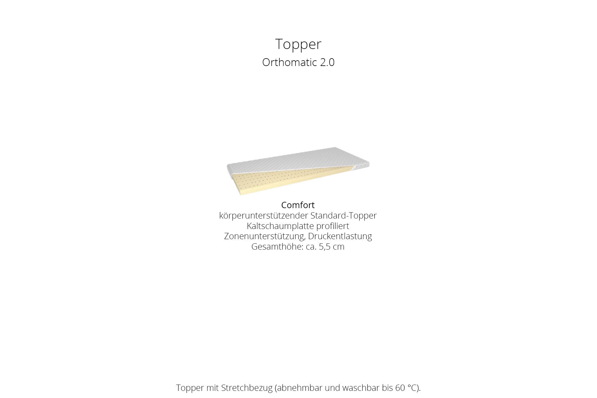 - Topper: Comfort - profilierte Kaltschaumplatte, Zonenunterstützung, Druckentlastung, Bezug Stretch (abnehm- und waschbar bis 60 °C, nicht trocknergeeignet)