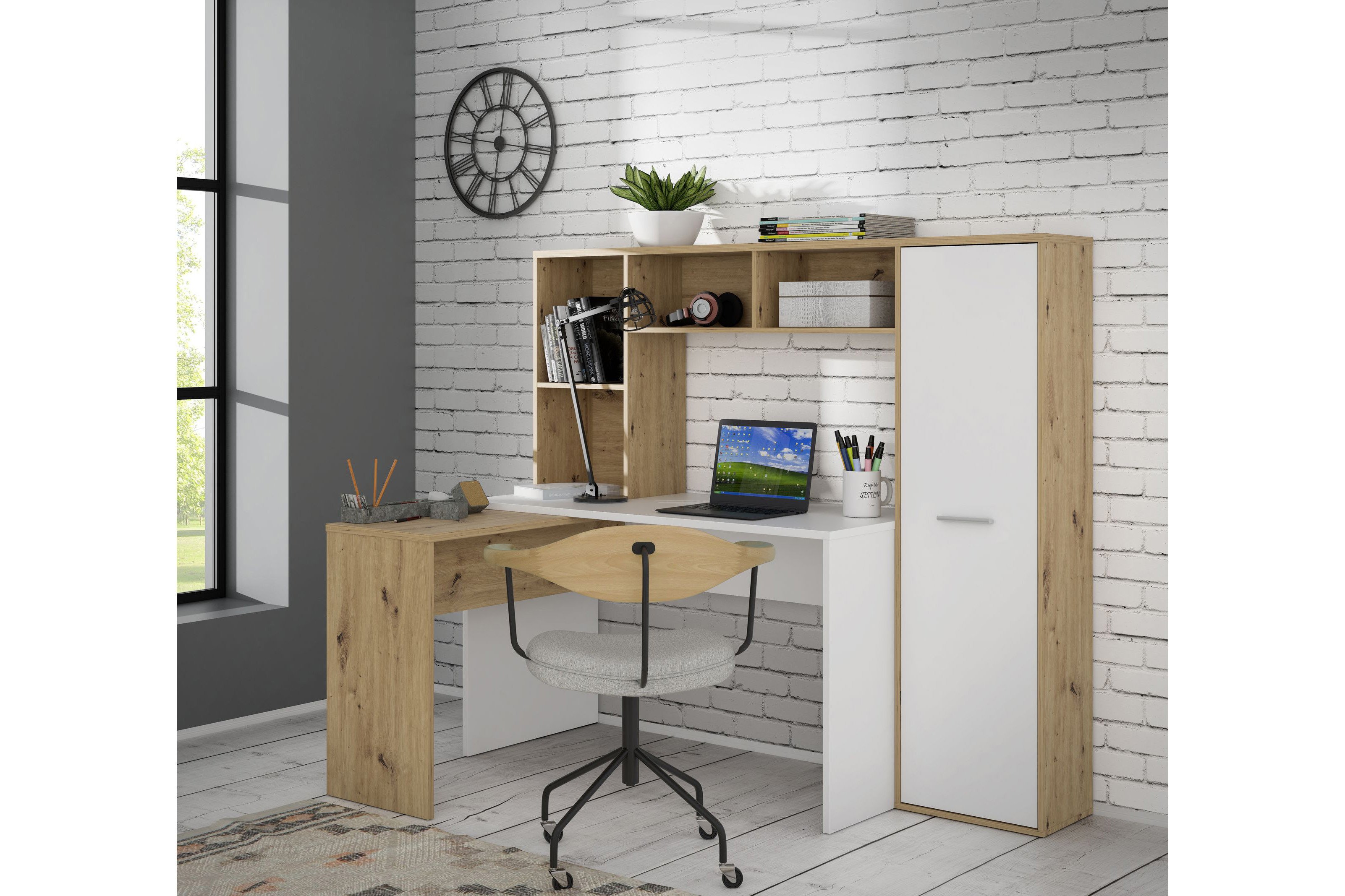 Wo nicht viel Platz für einen Schreibtisch oder gar ein ganzes Büro vorhanden ist, da bietet es sich besonders an, eine Kombination aus Arbeitsplatz und Stauraum zu nutzen. Dieses Möbelstück aus dem Programm Eriadu von Forte ist dafür eine mustergültige Lösung. Die ressourcenschonende Holznachbildung in der abgebildeten Artisan Eiche Ausführung, sorgt für einen natürlichen Anstrich und kombiniert mit den weißen Akzenten ergibt sich ein professionelles Erscheinungsbild. Die beiden über Eck angeordneten Schreibtischplatten ergeben zusammen eine großzügige Arbeitsfläche, ohne dabei viel Raum einzunehmen. Zudem lassen sich sowohl in als auch auf dem praktischen Umbau mit seinen vier offenen Fächern sowie der hohen Tür, hinter welcher sich der Innenraum mit drei Fachböden untergliedert, allerhand Arbeitsmaterialien verstauen oder auch eine ansprechende Dekoration und beispielsweise Zimmerpflanzen platzieren. Ob Home Office, Jugendzimmer oder Hobby-Raum – die Forte Schreibtische machen überall eine gute Figur.