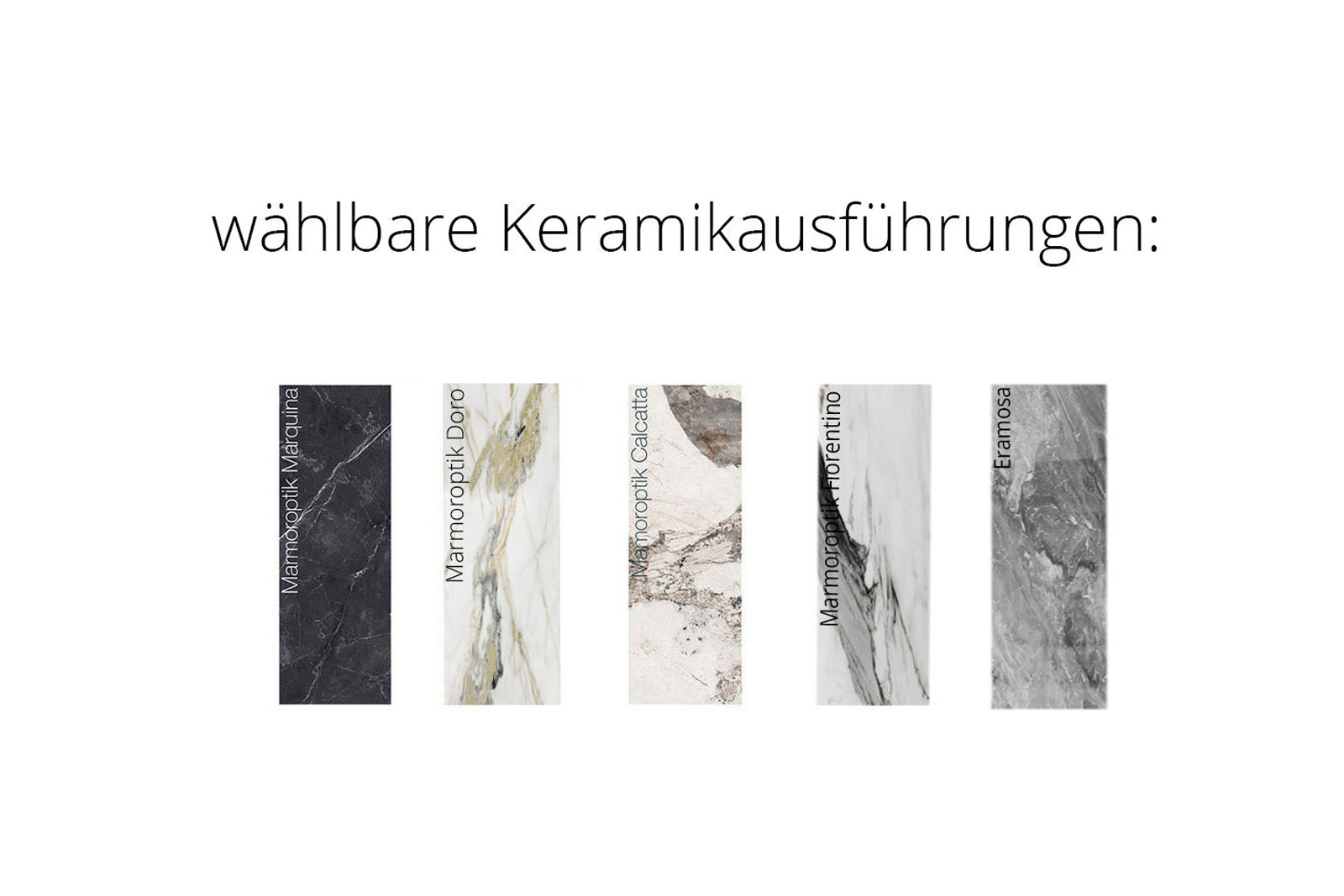 - Tischplatte: Keramik Marmoroptik Marquina, ca. 6 mm stark auf einer ca. 6 mm starken Glasplatte aufliegend