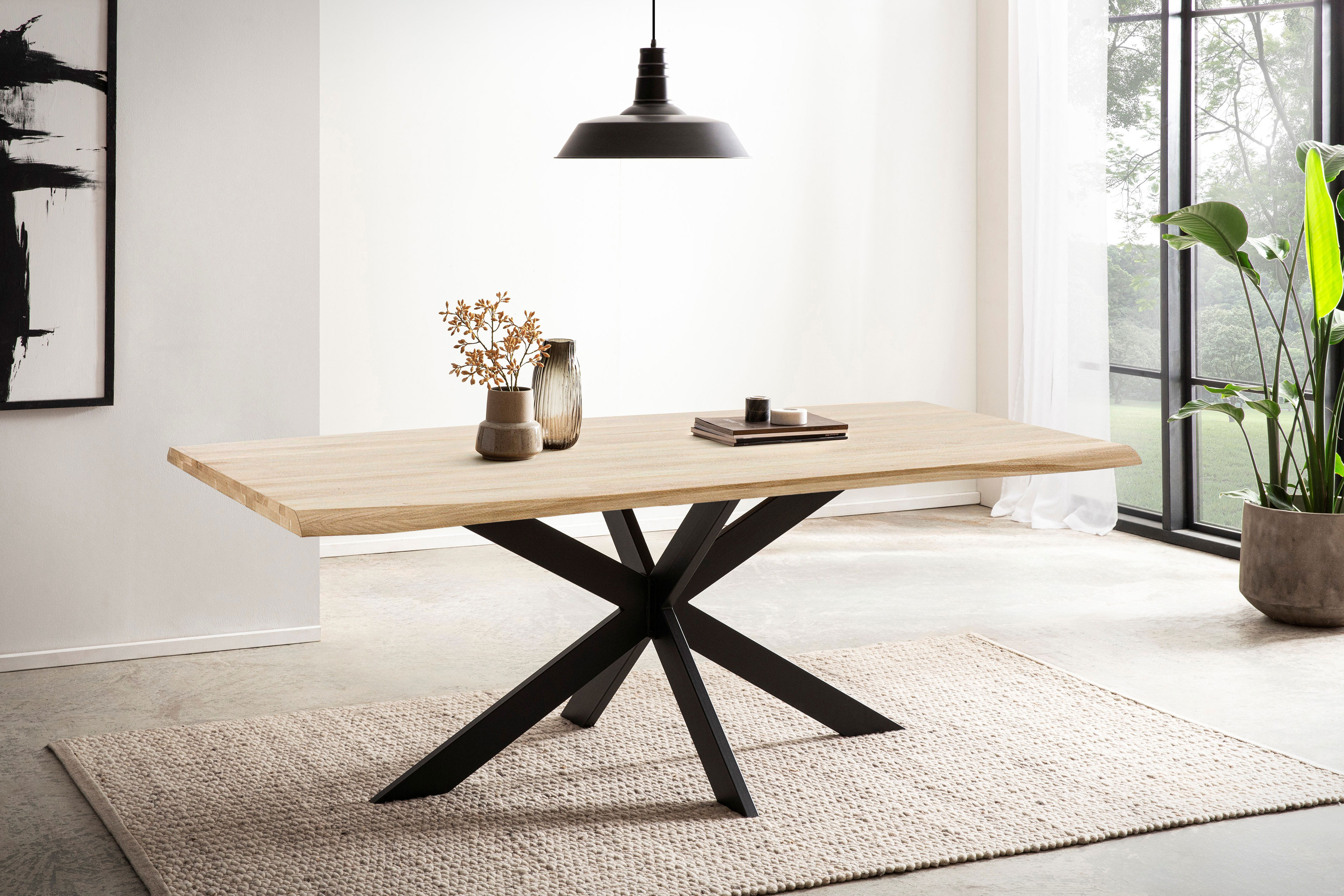 Der Esstisch Louis von Elfo zeigt sich in einem natürlichen Design und ist die perfekte Ergänzung für jedes Zuhause. Die Tischplatte aus hochwertiger, geölter Eiche besticht durch ihre durchgehende Lamelle, die nicht nur für eine ansprechende Optik sorgt, sondern auch die natürliche Maserung des Holzes zur Geltung bringt. Die gerade Kante an der kurzen Seite und die kunstvoll gestaltete Wellenkante an der langen Seite verleihen dem Tischmodell eine harmonische Balance zwischen modernem Stil und traditioneller Handwerkskunst. Mit einer Kantenstärke von etwa vier cm strahlt die Tafel Robustheit und Beständigkeit aus, während das innovative Spider-Gestell in hochkant verschweißtem Profil nicht nur Stabilität bietet, sondern auch einen markanten, industriellen Akzent setzt. Die schwarze Lackierung des Gestells fügt sich nahtlos in verschiedene Einrichtungsstile ein und ermöglicht eine vielseitige Kombination mit unterschiedlichen Möbeln und Dekorationen. Ob für gesellige Familienessen, festliche Anlässe oder entspannte Abende mit Freunden – der Elfo Esstisch wird zum zentralen Treffpunkt in Ihrem Zuhause und schafft eine einladende Atmosphäre. Investieren Sie in ein Möbelstück, das sowohl ästhetisch als auch funktional überzeugt und generationsübergreifend Freude bereitet. Der Esstisch von Elfo ist nicht nur ein Möbelstück, sondern ein Statement für Qualität und Stil in Ihrem Wohnraum.
