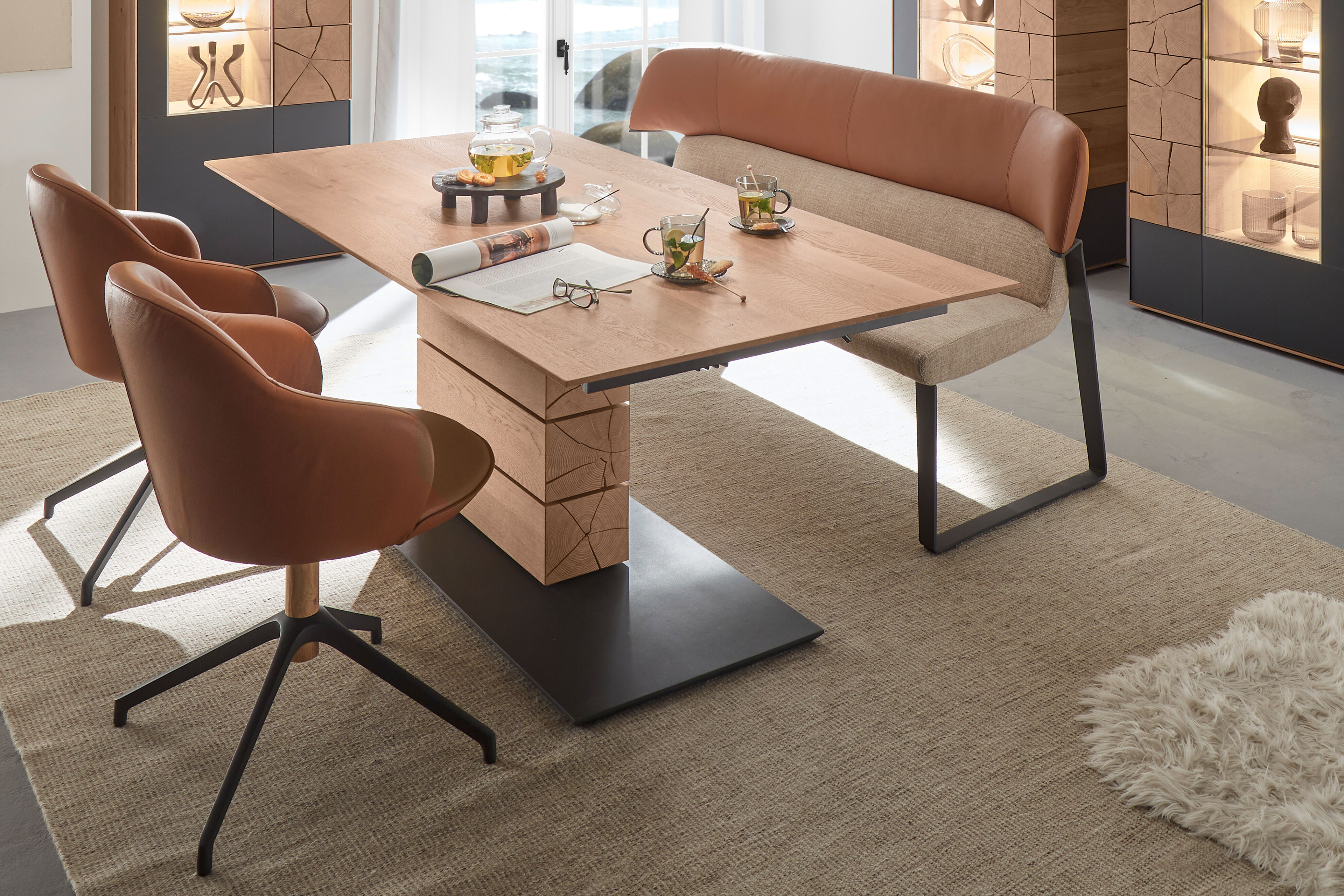 Der klassische, daher kommende Esstisch Caya aus dem Hause Hartmann präsentiert sich im natürlichen Design und überzeugt mit seiner praktischen Auszugsfunktion. Die etwa 16 mm starke Tischplatte ist aus dem massiven Holz der Kerneiche gefertigt und besitzt eine elegante Schweizer Kante. Dank seines Tischplattenmaßes von ungefähr 160 x 95 cm und dem integrierten Pöttker-Kopfauszug können bis zu zehn Personen an diesem Schmuckstück Platz nehmen und gemütlich mit Ihnen zu Abend essen. Ein absolutes Highlight ist das Säulengestell, dieses zeigt vier Hirnholzblöcke, welche auf Wunsch mit einer indirekten LED-Beleuchtung versehen werden können. Für den nötigen Stand sorgt die anthrazitfarbene Holzbodenplatte, die dem Modell eine exzellente Ausstrahlung verleiht. Die gezeigten Stühle namens Rico sowie die bequeme Polsterbank Eana runden das Gesamtbild vollständig ab und können zusammen mit den Beimöbeln in unseren Zusatzoptionen zum Esstisch dazu bestellt werden. Richten auch Sie Ihre Wohnräume im traumhaften natürlichen Stil ein mit dem Hartmann Esstisch Caya und genießen Sie schon bald das unvergleichbare Ambiente.