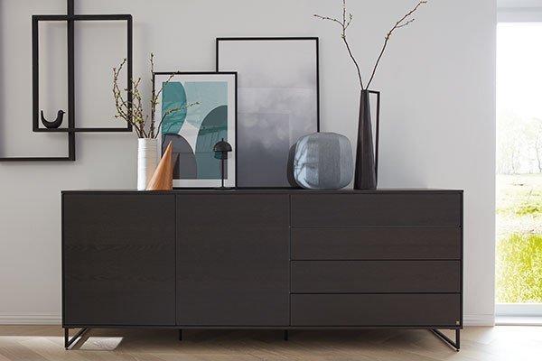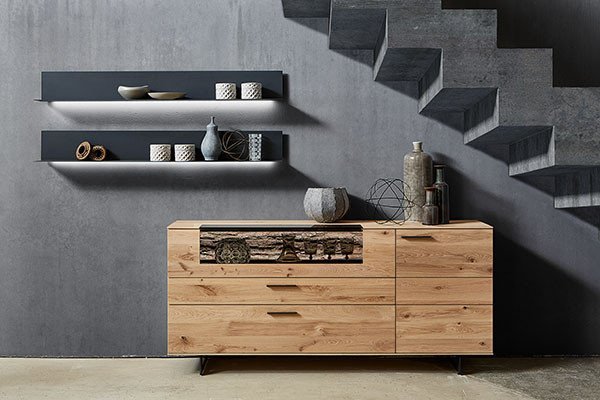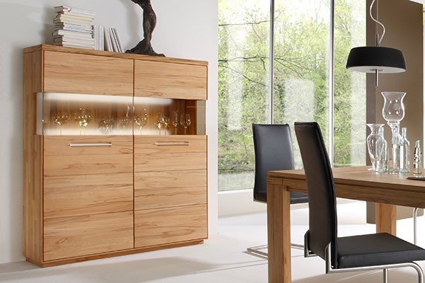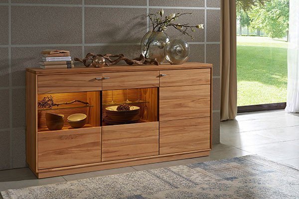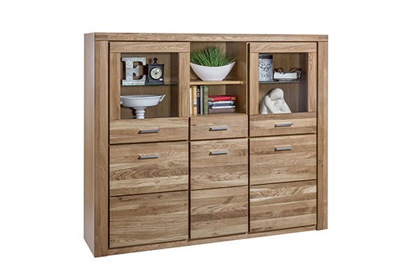In einer Esszimmer-Kommode bewahren Sie Geschirr und Besteck griffbereit am Esstisch auf, um sich lange Wege in die Küche zu sparen, wenn die Familie beim Abendessen sitzt. Eine Esszimmerkommode mit Glaseinsätzen setzt außerdem Ihre Sekt- und Weingläser in Szene, was bei einem Sideboard mit Beleuchtung noch eindrucksvoller gelingt. Auf der halbhohen Anrichte im Essbereich können Sie außerdem die Kuchenauswahl oder das Brunch-Buffet ansprechend arrangieren. Ein Sideboard im Esszimmer fördert nicht nur das gemütliche und ordentliche Raumambiente mit seinem Stauraumangebot, sondern eine zur Essgruppe passende Kommode vervollständigt Ihre Einrichtung auch stilistisch. Vom Sideboard für Ihr Landhausstil-Esszimmer bis zur modernen Kommode in Weiß Hochglanz führen wir Esszimmermöbel online für alle Wohnstile. Besonders beständig in Sachen Qualität und Design sind Esszimmer-Kommoden aus Holz, die Sie beispielsweise als Sideboard aus Eiche, Buche oder Mangoholz kaufen können. Bestellen Sie online das ideale Sideboard oder Highboard für Ihr Esszimmer oder konfigurieren Sie direkt die komplette Essgruppe mit Kommode, Tisch und Stühlen.