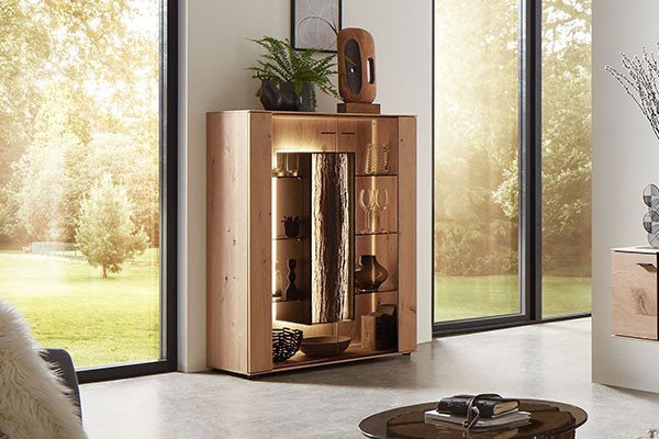 Geschirr und Besteck sind nahe der Essgruppe am besten aufgehoben, denn so erübrigen sich lange Laufwege, wenn Sie am Tisch einen weiteren Teller oder eine neue Gabel brauchen. Für den nötigen Stauraum eröffnen unsere Esszimmermöbel ganz unterschiedliche Lösungen – wählen Sie etwa aus niedrigen Anrichten, geräumigen Highboards sowie klassischen Buffetschränken. Bei der Wahl kommt es maßgeblich darauf an, was Sie in der Kommode bzw. dem Schrank unterbringen möchten. Flache Anrichten oder andere kleine Sideboards reichen aus, um ein Tafelservice im Speisebereich unterzubringen. In Esszimmerkommoden mit Schubladen sortieren Sie auch Besteck und Tischdekorationen übersichtlich ein. Während geschlossene Kommodenfronten aufgeräumt erscheinen, lockern offene und verglaste Fächer das Sideboard angenehm auf. Hier können Sie einzelne Schalen oder Vasen ästhetisch platzieren. Über niedrigen Sideboards im Esszimmer bleibt außerdem Platz für Hängeregale, Spiegel oder Wandbilder, um das harmonische Raumambiente abzurunden. Geräumige Esszimmerschränke eignen sich, um Geschirr, Gläser oder auch Tischdecken und Platzsets in der Nähe Ihrer Essgruppe zu verstauen. Mit einem Vertiko, Highboard oder Buffetschrank richten Sie ein separates Esszimmer gelungen ein, schaffen aber ebenso einen geschmackvollen Übergang von der offenen Küche zum Speisebereich. Für kleine Essbereiche bieten hohe und eher schmale Esszimmerschränke viel Stauraum auf vergleichsweise geringer Stellfläche. Entdecken Sie bei Möbel Letz ansprechende Designs und hochwertige Materialien für Ihre neuen Aufbewahrungsmöbel im Esszimmer - von naturnahem Massivholz über individuelle Vintage- und Retrolooks bis zu elegantem Hochglanz. Mit einer teilweise zubuchbaren Beleuchtung heben Sie Ihre Lieblingsstücke in der Esszimmerkommode oder dem Esszimmerschrank noch hervor und kreieren ein stimmungsvolles Raumambiente für gemeinsame Abendessen.