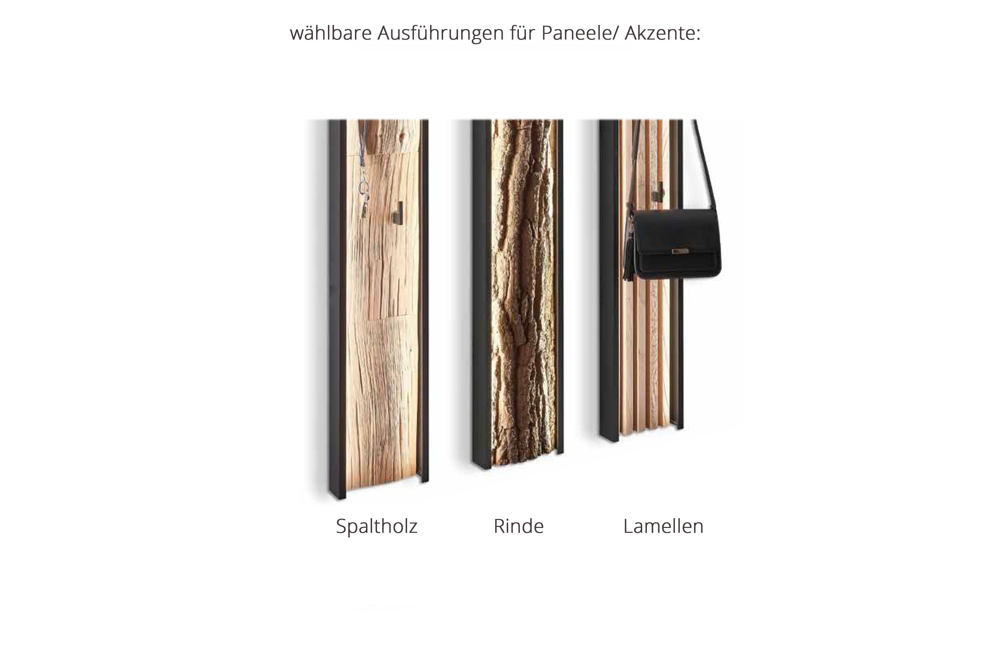 Die Garderobe Salvo von Hartmann Möbel verbindet natürliche Materialien, modernes Design und nachhaltige Verarbeitung zu einem hochwertigen Einrichtungselement für Ihren Eingangsbereich. Charakteristisch für dieses Modell sind die einzigartigen Applikationen aus echter Rinde. Front und Korpus bestehen aus massiver, weiß lackierter Kernbirke, einem langlebigen und besonders ausdrucksstarken Holz mit feiner Maserung. Dieser Naturwerkstoff wird von Hartmann sorgfältig verarbeitet und stammt aus nachhaltiger Forstwirtschaft – ideal für alle, die Wert auf ökologische Möbel legen. Der Schuhschrank der Garderobe Salvo bietet durch seine vier Klappen, hinter denen sich jeweils ein praktischer Schuhkorb verbirgt, viel Stauraum und eine übersichtliche Organisation. Ergänzt wird das Möbel durch zwei offene Fächer, die dekorative Akzente setzen oder schnellen Zugriff auf häufig genutzte Accessoires ermöglichen. Die abgebildeten Paneele sowie eine passende Beleuchtung sind optional erhältlich und ermöglichen eine individuelle Gestaltung je nach Raumsituation und persönlichem Stil. Salvo vereint Design, Funktionalität und Natur – für einen Eingangsbereich, der stilvoll empfängt und nachhaltig überzeugt.