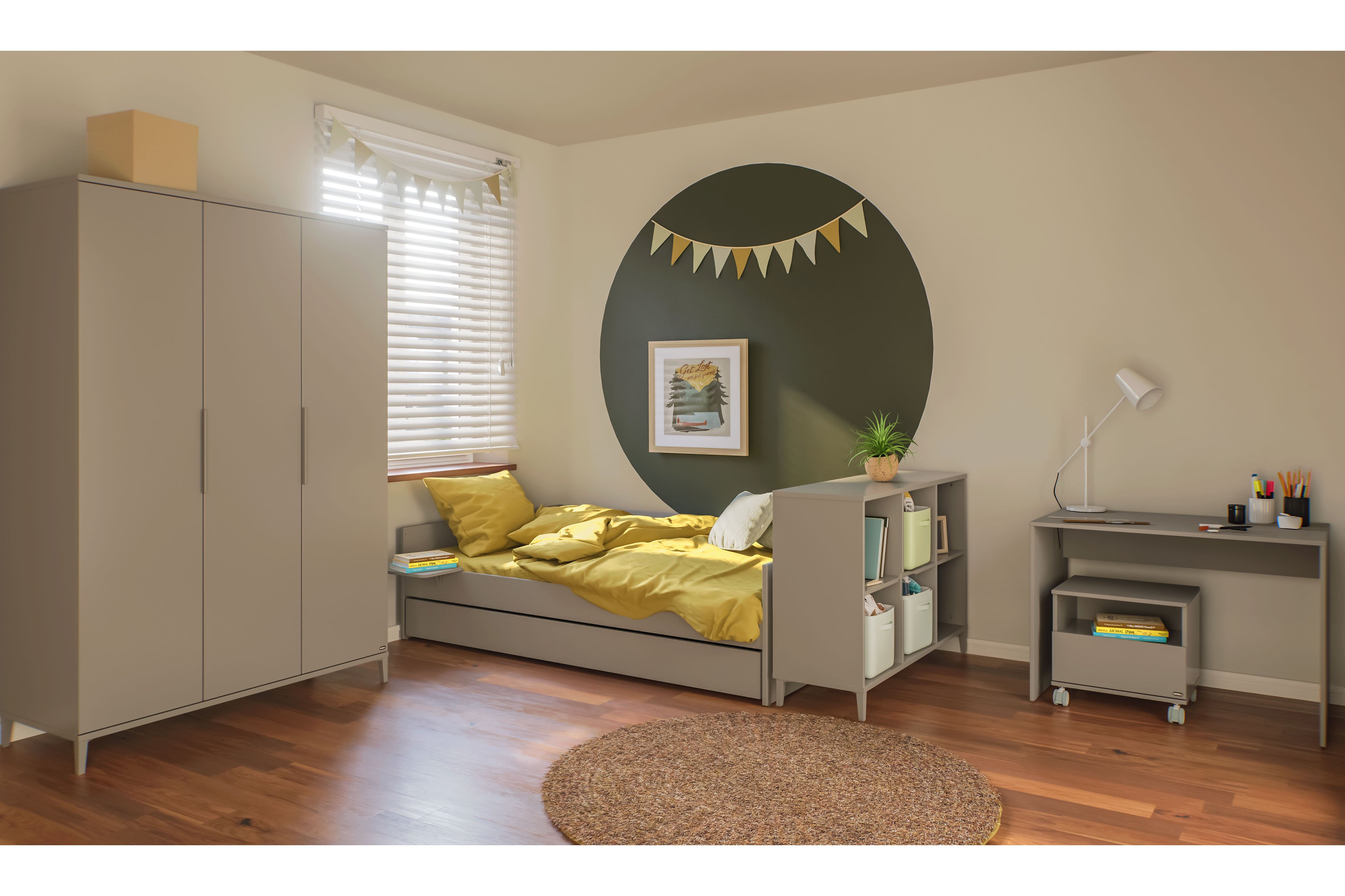 Die Jugendzimmer-Serie Brother Stu von YUNY by Paidi, einer Kollektion für junge Familien, bringt zeitloses Design und durchdachte Funktionalität zusammen. Die Gestaltung in grau-braunem Lack Taupe mit farblich dazu passenden Griffen und Füßen sorgt für eine entspannte, zeitgemäße Stimmung, die sich leicht in verschiedene Wohnideen einfügt und aktuell bleibt. Der Dreh- und Angelpunkt der Einrichtung ist der Kleiderschrank mit drei Türen, deren Dämpfung ein leises und sanftes Schließen ermöglicht. Die strukturierte Inneneinteilung mit einer Trennwand schafft Übersicht: Das linke 85er Fach mit einem Boden und zwei Kleiderstangen bietet reichlich Raum vorrangig für hängende Kleidungsstücke, während sich das rechte 40er Fach mit drei Einlegeböden perfekt für zusammengelegte Sachen und/ oder Körbe eignet - so herrscht Ordnung ohne Abstriche. Abgerundet wird das Set durch das Bett mit integriertem Schubkasten, der entweder als Stauraum oder als schnell verfügbares Bett für Gäste zum Einsatz kommen kann. Für die Nutzung als Gästebett ist eine Matratze von maximal etwa 90 x 11 x 190 cm nötig. Zudem bietet Brother Stu als frei kombinierbares Jugendzimmer maximale Freiheit bei der Gestaltung. Mit dem leicht zu bedienenden Konfigurator-Tool kann man die Einrichtung individuell planen oder über unsere Zusatzoptionen mit wenigen Mausklicks passende Ergänzungen direkt aussuchen und in den Warenkorb legen. So entsteht ein persönlich zugeschnittenes Jugendzimmer aus dem Einrichtungsprogramm Brother Stu von YUNY by Paidi.