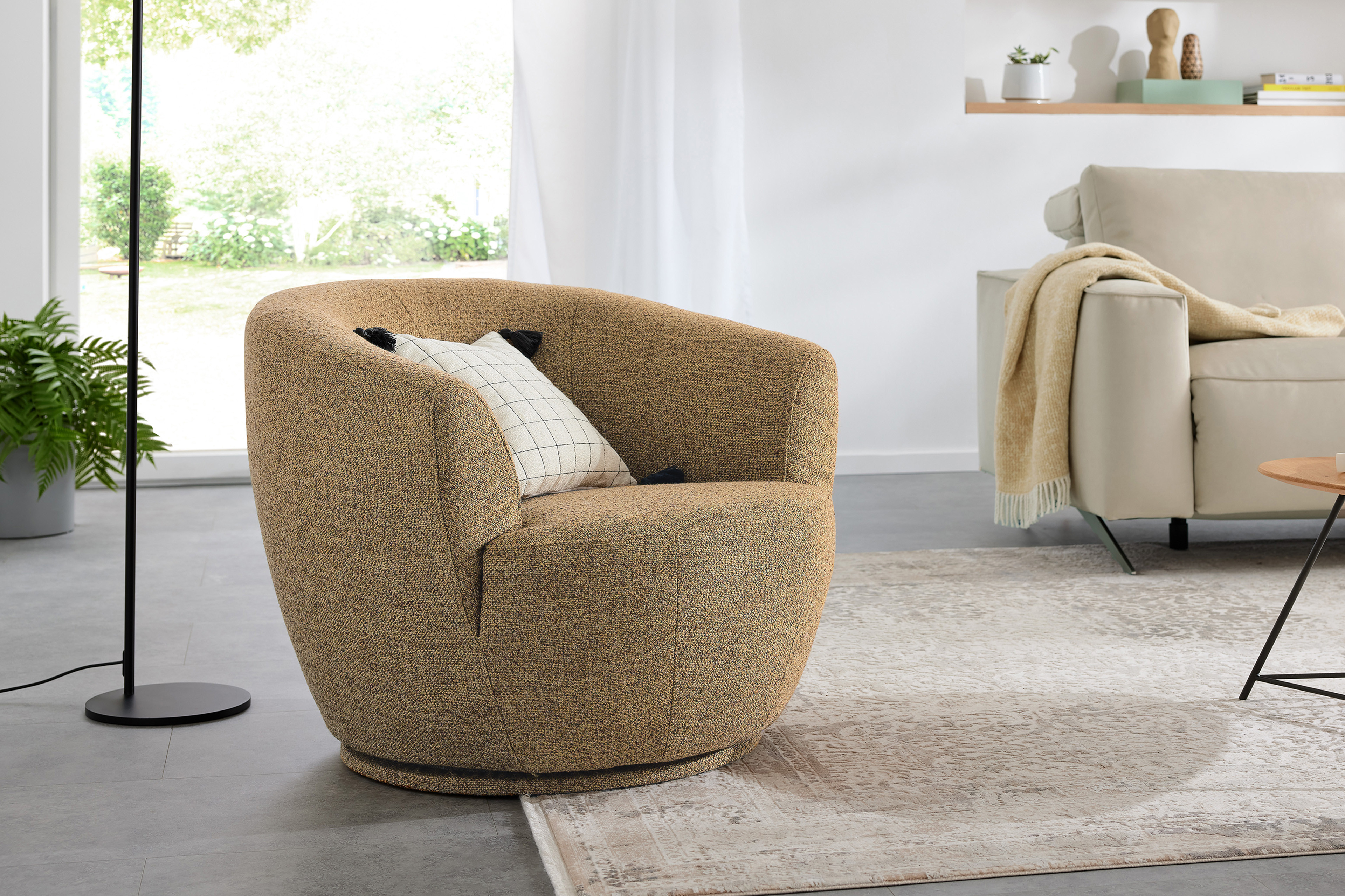 Ob als Solist in der Leseecke oder stilvoller Blickfang im Wohnzimmer - der charmante Einzelsessel MR 9455 von Musterring fügt sich mühelos in fast jeden Wohnbereich ein und wird schnell zu Ihrem neuen Lieblingsplatz. Mit seinem eleganten Stoffgewand in einem warmen Farbton sowie seiner sanft gerundeten Silhouette strahlt dieses Möbelstück nicht nur absolute Behaglichkeit und Ruhe aus, sondern bereichert Ihr Zuhause ebenfalls mit zeitloser Eleganz. Das Design wirkt mit dem Drehtellerfuß, welcher in Bezug auf den Sessel angepasst wurde, besonders klar und harmonisch, wodurch ein stimmiges sowie modernes Gesamtbild entsteht. Die sorgfältig abgestimmte Polsterung aus Polyätherschäumen sowie einem HR-Schaum vermittelt schon beim ersten Platznehmen ein Gefühl von Geborgenheit und schenkt Ihnen ein angenehmes Sitzempfinden, sodass Sie Ihre gemütlichen Lesestunden oder Filmabende genießen können. Ein besonderes Highlight ist die 360°-Drehfunktion: Dank dieser Ausstattung passt sich der Musterring Sessel an jede Situation an und wird zum idealen Begleiter im Alltag. Sollte Ihnen das Bouclé-Outfit in der Farbe "camel" nicht gefallen, finden Sie unter der Rubrik "Wunschbezug - Farbe ändern" eine große Auswahl an diversen Bezugsmaterialien mit hellen sowie dunklen oder dezenten und kräftigen Farbnuancen. Der Drehsessel MR 9455 von Musterring lässt keine Wünsche offen und ist eine Einladung zum Entspannen sowie Wohlfühlen.