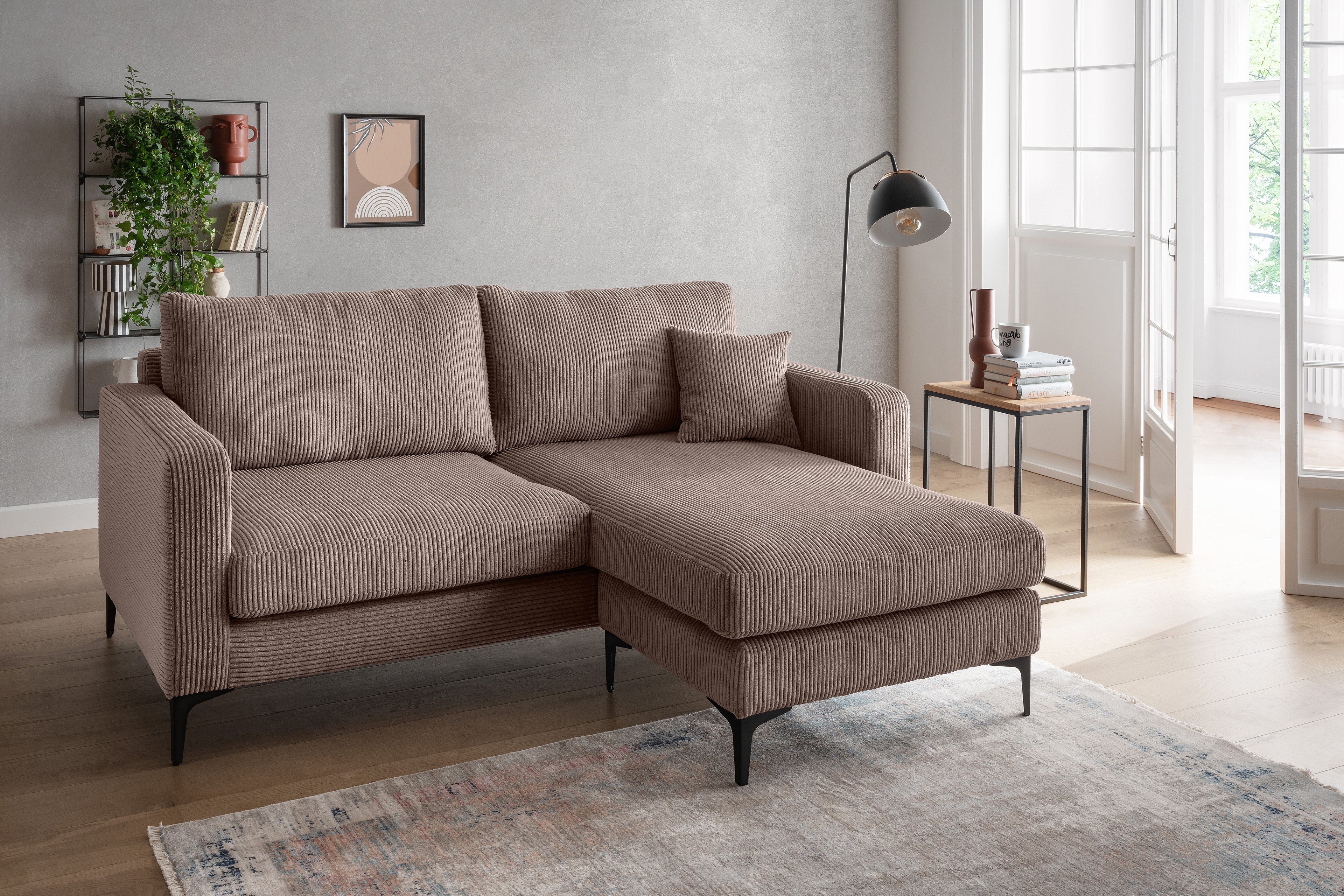Sie sind noch auf der Suche nach einer modernen Polstergarnitur, die Ihnen den nötigen Raum bietet, um einen gemütlichen Abend vor dem Fernseher zu verbringen, doch leider ist Ihr Wohnzimmer alles andere als groß? Vielleicht könnte das Ecksofa Eliza aus dem Hause Benformato Polstermöbel die langersehnte Lösung sein, denn mit einem Stellmaß von ca. 204 x 153 cm lässt sich das Sofa in kleine wie auch in verwinkelte Räume problemlos integrieren. Die Zusammenstellung aus einem Sitzelement und einem Hockerelement sowie die losen Sitzkissen, welche mit einem Klettverschluss an den Elementen befestigt sind, ermöglichen Ihnen zudem, die Richtung des Ecksofas ganz einfach zu ändern. Doch auch optisch weiß das Benformato Sofa zu überzeugen, so besticht der braune Cordbezug mit einer angenehm weichen Haptik und verleiht seinem neuen Wirkungskreis eine behagliche Note. Als Herzstück des Möbelstücks dient eine hochwertige Wellenunterfederung, die für eine gleichmäßige Gewichtsverteilung sorgt und den formstabilen Komfortschaum, der sich dem Körper sanft anpasst, ohne weich nachzugeben, optimal stützt. Für einen individuellen Look stehen Ihnen zahlreiche Bezugsmaterialien in den unterschiedlichsten Farbtönen zur Auswahl - von zeitlosen Naturtönen über warme Erdtöne bis hin zu mutigen Statements in Gelb, Petrol oder Rot ist hier alles dabei. Eliza von Benformato - Ihr Lieblingsplatz für jeden Tag.