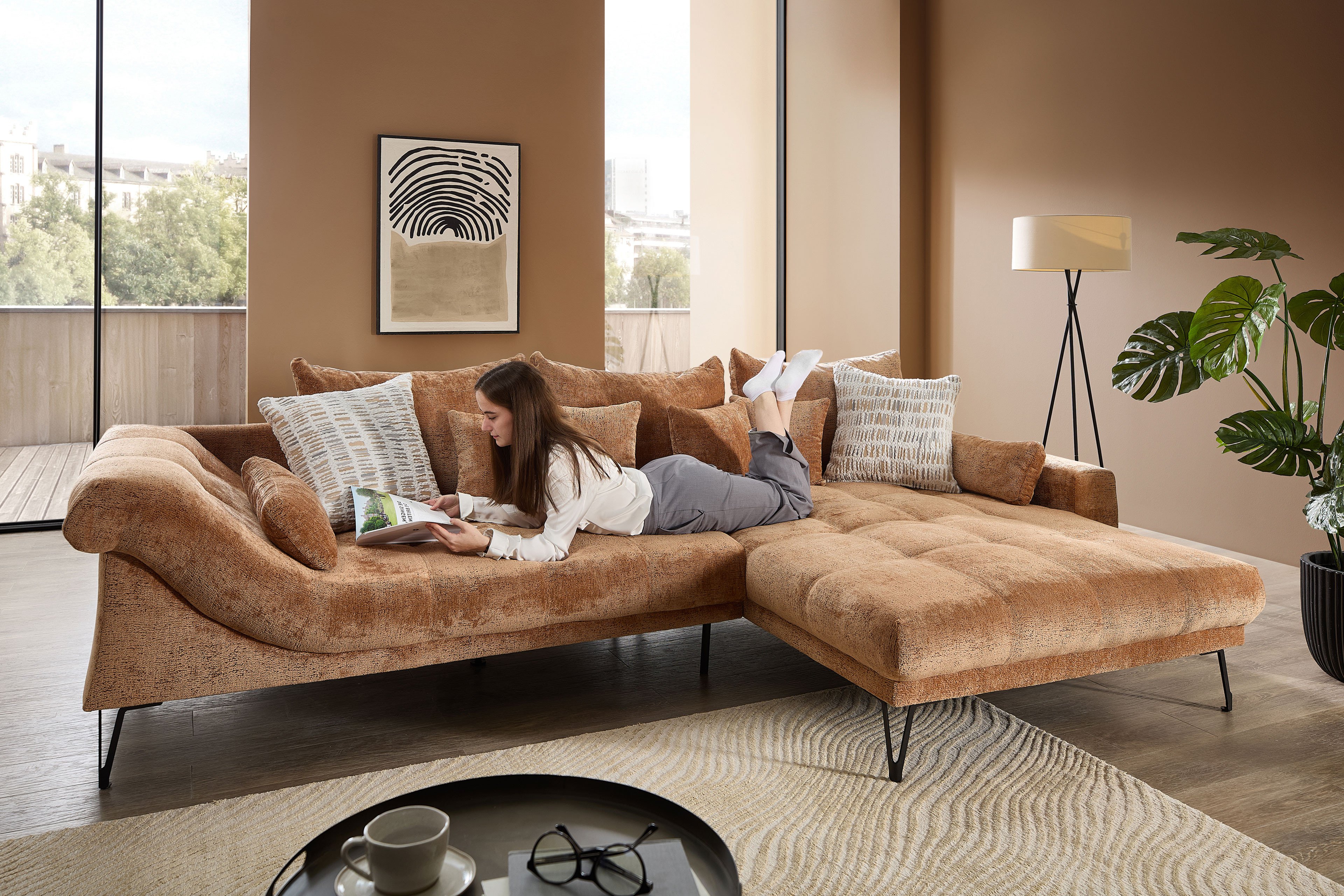 Erweitern Sie Ihr Wohnzimmer mit einem stilvollen Sitzmöbel, welches sich harmonisch in Ihren Einrichtungsstil einfügt und dabei eine behagliche Note versprüht - das Ecksofa Garda aus dem Hause Benformato Polstermöbel. Bezogen in einem hellbraunen Chenille-Flachgewebe, welches sich durch seine angenehm weiche Haptik sowie Pflegeleichtigkeit auszeichnet, und ausgestattet mit einer Vielzahl an Zierkissen, die Sie durch die Wahl des Bezugsmaterials sowie des Farbtons ganz an Ihren Geschmack anpassen können, zieht das Sofa stets alle Blicke auf sich und weckt den Wunsch, sich hier niederzulassen, um dem hektischen Alltag für einen Moment zu entkommen. Grazile Metallfüße in Schwarz vervollständigen das moderne Gesamtbild und schaffen durch ihre Höhe von etwa 19 cm, neben einer schwebenden Optik, ausreichend Bodenfreiheit für den Saugroboter. Die Zusammenstellung aus einem 2-Sitzer und einer Recamiere hält ein großzügiges Stellmaß von ca. 314 x 192 cm für Sie bereit - hier finden Sie ausreichend Platz für einen Nachmittagskaffee mit Ihrer besten Freundin oder für einen gemütlichen Fernsehabend mit Ihrer Familie, eingekuschelt in Ihre Lieblingsdecke und mit einer Schale Knabbereien in der Hand. Garda von Benformato - Ankommen. Fallenlassen. Wohlfühlen.