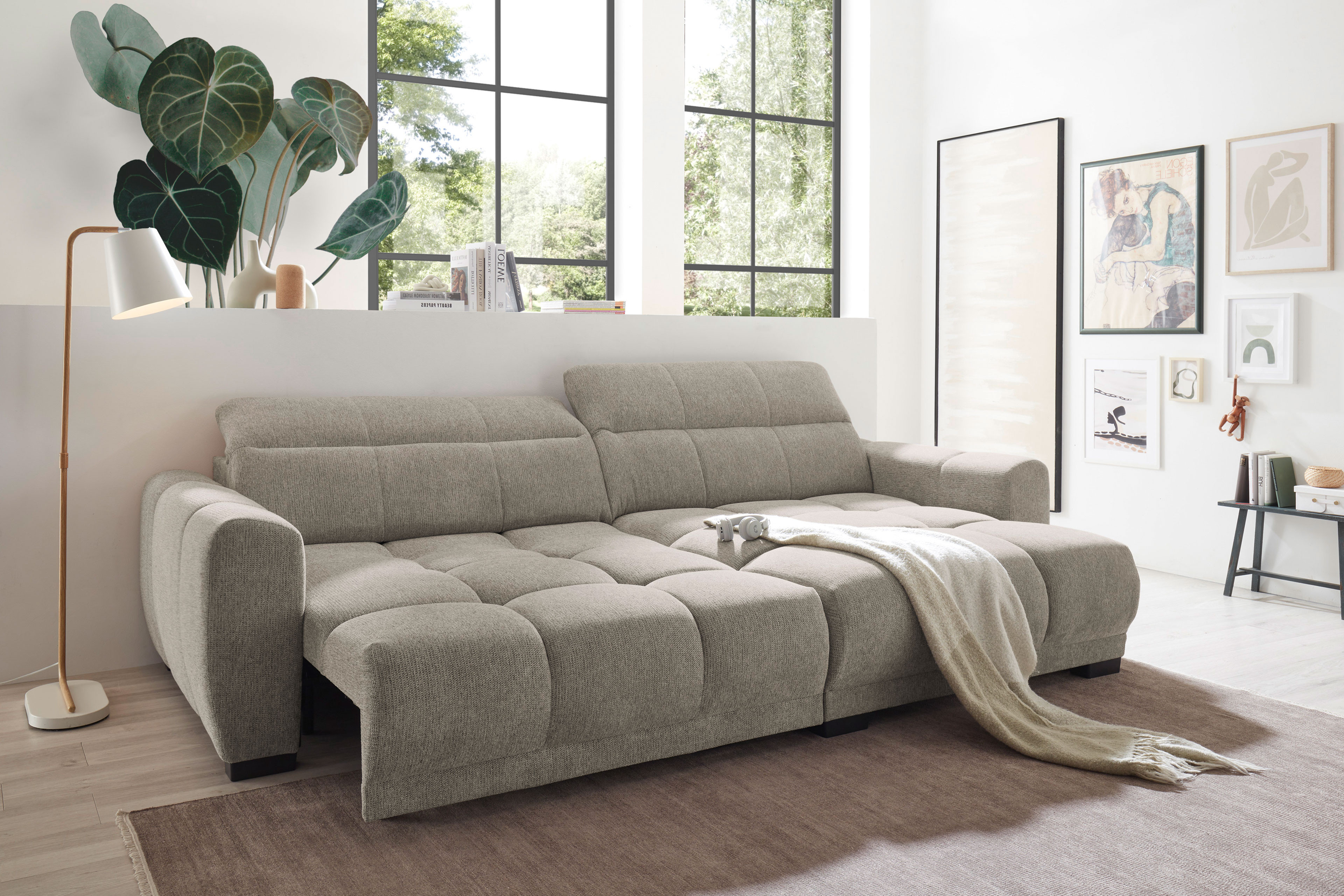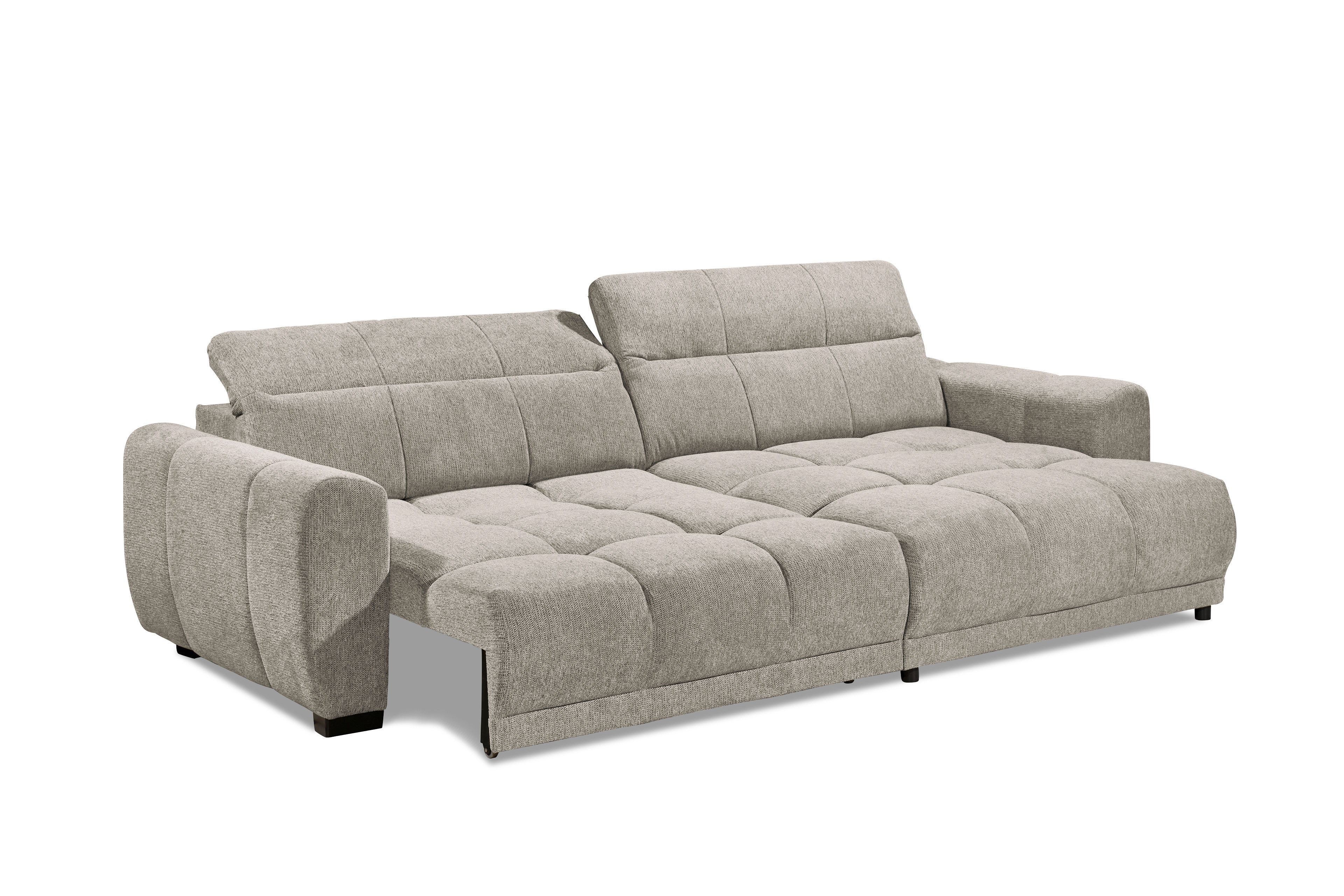 Erleben Sie Entspannung auf einem neuen Level. Mit einem großzügigen Stellmaß von ca. 177 x 302 cm überzeugt das Ecksofa Hunter aus dem Hause ED-Lifestyle und wird zum Mittelpunkt Ihres Wohnzimmers. Der moderne Stoffbezug in einem zeitlosen Hellgrau verleiht Ihren Räumlichkeiten eine freundliche, exklusive Atmosphäre, während der echt bezogene Rücken Ihnen die volle Freiheit bei der Gestaltung lässt - ob klassisch vor der Wand oder als stilvoller Raumteiler zum Essbereich. Das Herzstück dieses ED-Lifestyle Sofas ist seine kompromisslose Bequemlichkeit. Eine Kombination aus hochwertigem Schaumstoff auf einer Nosagunterfederung garantiert einen erstklassigen Sitzkomfort auf stabilen Kunststofffüßen. Für den individuellen Wohlfühlmoment sorgt die eingebaute motorische Sitztiefenverstellung. Damit lässt sich die Sitzfläche des 2-Sitzers mühelos von ca. 66 cm auf beachtliche, etwa 125 cm erweitern - perfekt, um sich nach einem langen Tag so richtig auszustrecken, zu kuscheln oder einfach die Seele baumeln zu lassen. Die zusätzlich verstellbaren Kopfteile ermöglichen dabei jederzeit eine ergonomisch perfekte Kopfablage. Auch für spontane Übernachtungsgäste ist bestens gesorgt. Durch das Ausfahren der Sitztiefenverstellung verwandelt sich das Sofa im Handumdrehen in eine gemütliche Liegefläche von etwa 240 x 125 cm. Hunter von ED-Lifestyle vereint praktischen Nutzen mit modernem Design und lädt dazu ein, jeden Abend in vollen Zügen zu genießen.