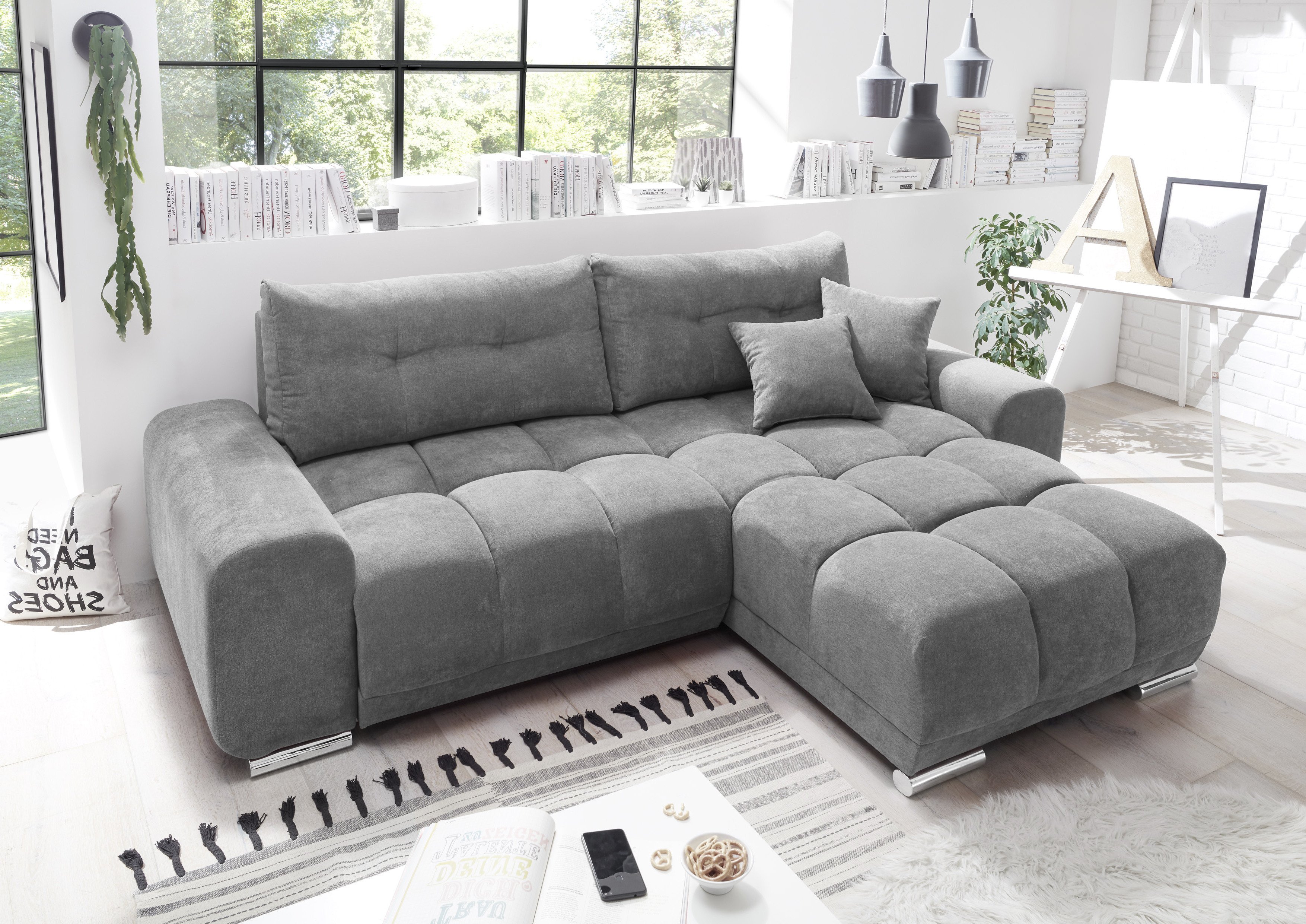 Pakka aus der Kollektion Letz - tagträumen, wohlfühlen, Gäste empfangen, einfach mal ausspannen und sich selbst belohnen. Das alles wäre undenkbar ohne eine passende Sitzgelegenheit. Die zeitlos schöne Eckgarnitur bietet hierfür das nötige Areal. Und das auch noch in makelloser Gestalt und komfortabler Polsterung. Leicht abgerundete Armlehnen sowie eine auffällige Steppung in der Sitzfläche verleihen der Garnitur einen offenen und zugleich herzlichen Eindruck. Laden Sie alte Bekannte und liebe Verwandte ein und bieten Sie Ihnen ein Nachtlager für erholsamen Schlaf an. Mit den vorbereiteten Bettgarnituren, welche Sie im praktischen Stauraum unter der Sitzfläche lagern können, ist schnell eine gemütliche Liegefläche von etwa 200 x 147 cm gezaubert. Inklusive Rücken- und Zierkissen sorgen für Behaglichkeit, eine glänzende Fußausführung für Eleganz und clevere Funktionen machen das Sofa alltagstauglich. Alles in allem ein Komplettpaket, gefüllt mit jeder Menge fantastischen Eigenschaften, für ein großartiges Sitzerlebnis. Greifen Sie jetzt zu und nennen Sie das Modell Pakka aus der Kollektion Letz bald Ihr Eigen - zu einem genialen Sonderpreis!