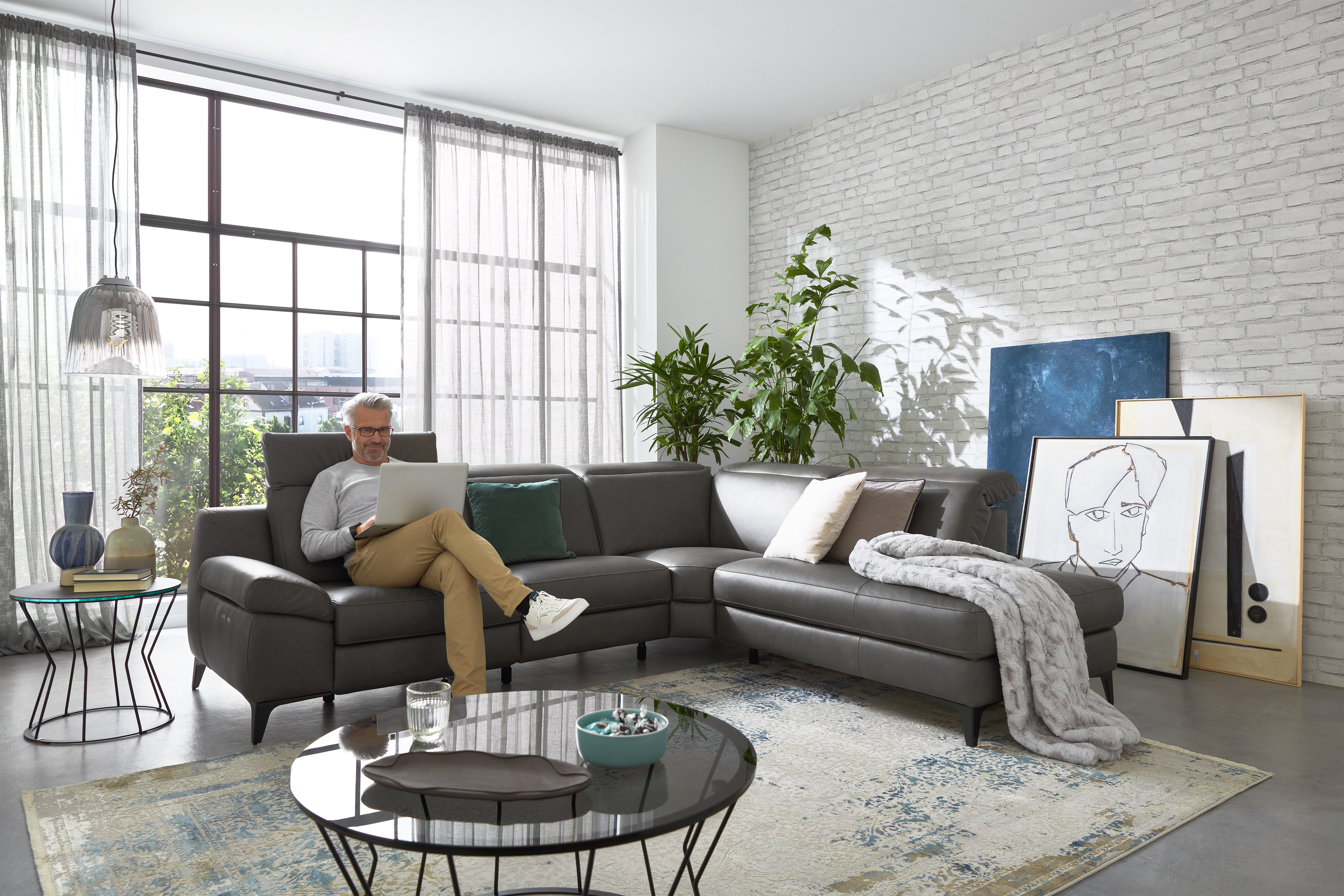 In diesem Angebot stellen wir Ihnen das elegante Musterring Sofa MR 9120 vor, welches nicht nur mit seiner zeitlosen Optik und seiner großzügigen Sitzfläche alle Blicke auf sich zieht, sondern auch beim Platznehmen mit einem himmlischen Komfort überzeugt. Dieses Möbelstück wird mit einem Platzangebot von etwa 280 x 240 cm zur einladenden Wohlfühloase, auf der Sie nach einem ereignisreichen Tag perfekt abschalten und eine behagliche Auszeit mit Ihrem Lieblingsroman oder einer spannenden Fernsehsendung genießen können. Weich und zugleich stützend - die sorgfältig abgestimmte Polsterung aus einem HR-Kaltschaum sorgt nicht nur für ein ausgezeichnetes Sitzerlebnis, sondern vermittelt ein Gefühl von Stabilität sowie Geborgenheit. Aber auch mit seinem attraktiven Design punktet dieses Sitzmöbel. Während das graue Lederoutfit dem Ecksofa eine luxuriöse Ausstrahlung verleiht sowie Eleganz versprüht, setzen die schwarzen Metallfüße einen dezenten, modernen Kontrast und runden das Gesamtbild stilvoll ab. Ein absolutes Highlight ist die Armteilverstellung, welche eine gemütliche Liegeposition ermöglicht, sowie die manuelle Kopfteilverstellung, die optimalen Halt für Nacken und Schultern bietet. Optional lässt sich das Schmuckstück mit einer motorischen Relaxfunktion ausstatten. Per Knopfdruck senkt sich in Sekundenschnelle die Rückenlehne und die Fußstütze fährt hoch. So entsteht eine komfortable Ruhezone, in der einem Mittagsschläfchen nichts mehr im Wege steht. Diese sowie einen zusätzlichen Hocker, verschiedene Fußvarianten, Polsterungen, Sitzhöhen sowie eine weitere Armlehnenausführung finden Sie unter den Zusatzoptionen. Außerdem lässt sich mit einem Klick auf "Farbe ändern" das Gewand des Modells anpassen. Ob in einem schlichten, modernen Leder- oder lebendigen, ausdrucksstarken Stoffbezug: Wählen Sie dank der breiten Auswahl an diversen Materialien und Farbnuancen Ihren persönlichen Favoriten. MR 9120 von Musterring ist ein Ort zum Relaxen, Lachen und Träumen.