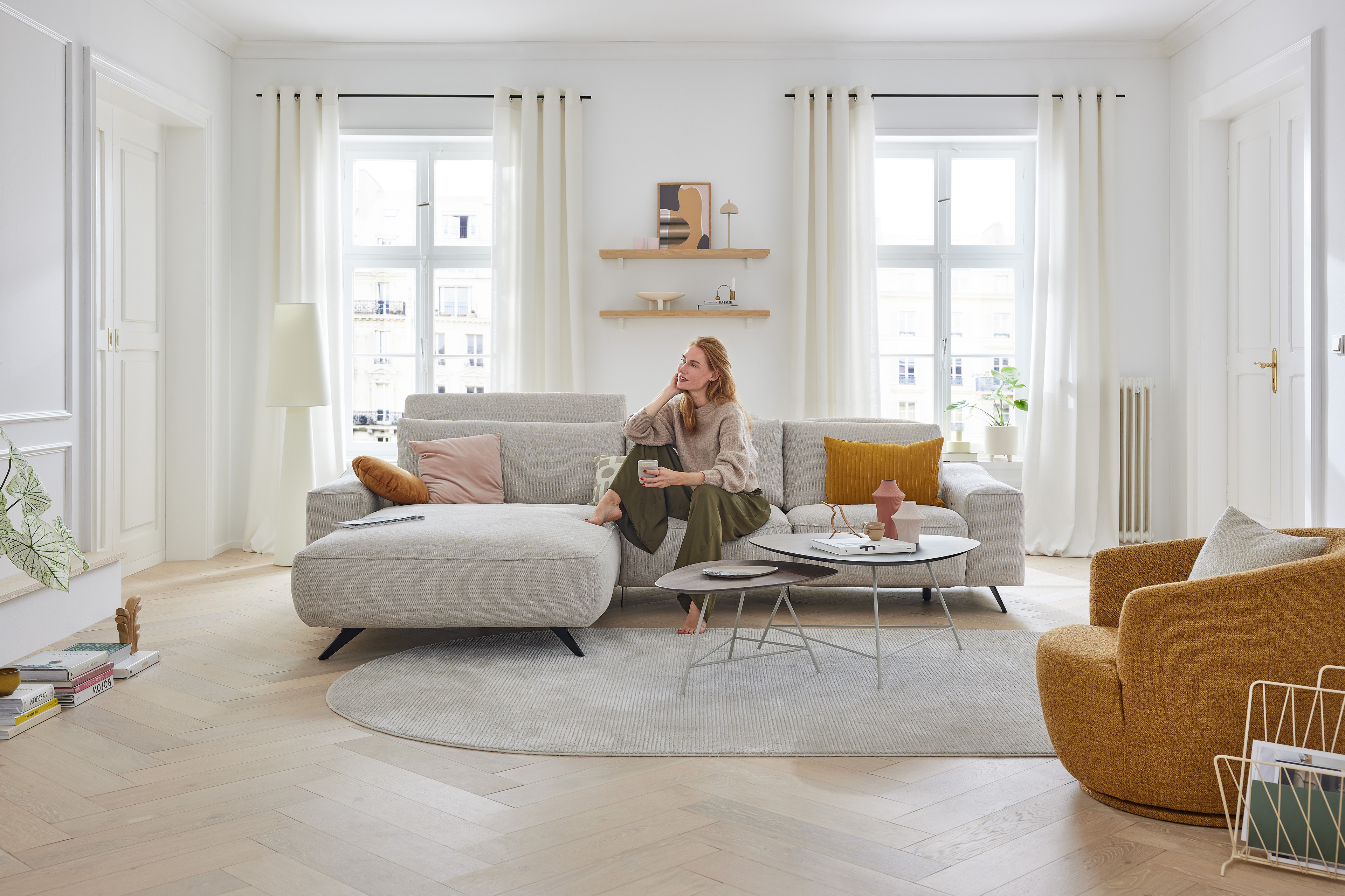 Mit einer großzügigen Stellfläche von etwa 215 x 320 cm wird die Eckgarnitur MR 9450 von Musterring zum Mittelpunkt in Ihrem Wohnzimmer, welche ausreichend Platz bietet, um sich nach einem stressigen Arbeitstag entspannt zurückzulehnen und mit einem guten Buch abzuschalten oder sich mit Ihren Freunden auf ein paar Drinks mit leckeren Snacks zu treffen. Damit Sie sowie Ihre Gäste einen angenehmen Komfort genießen können, ist die Sitzfläche im Inneren mit einem hochwertigen HR-Kaltschaum, welcher auf einer stabilen Nosagwellenfederung ruht, gepolstert. Diese lädt dazu ein, Platz zunehmen und erholsame, gesellige Momente zu erleben. Auch mit ihrer zeitlosen Optik, weiß die Couchgarnitur zu überzeugen: Stehend auf schwarzen Metallkufen sowie gehüllt in ein Chenille-Flachgewebe im zauberhaften Farbton "naturel" setzt das l-förmige Sofa stilvolle Akzente in Ihren Räumlichkeiten und verleiht zudem eine einladende Atmosphäre. Um das Outfit exakt auf Ihren Einrichtungsstil sowie Ihre Vorstellungen abzustimmen, hält unsere vielseitige Stoffkollektion, welche Sie unter dem Punkt "Farbe ändern" finden, eine breite Auswahl an diversen Materialien mit traumhaften Farbnuancen für Sie bereit. Zudem können Sie über unsere Zusatzoptionen das Design der Füße, die Breite der Armlehne, die Sitzhöhe sowie die Polsterung anpassen und das Modell mit weiteren Extras ausrüsten. Neben Kopfstützen, welche bei einer aufrechten Sitzhaltung unterstützen, können Sie den 1-Sitzer mit Armlehne sowie das Zwischenelement mit einer motorischen Relaxfunktion ausstatten, wodurch sich die Rückenlehne senkt und die Fußstütze hochfährt. Das Musterring Sofa schenkt Ihnen den perfekten Platz zum Wohlfühlen und Relaxen - MR 9450.