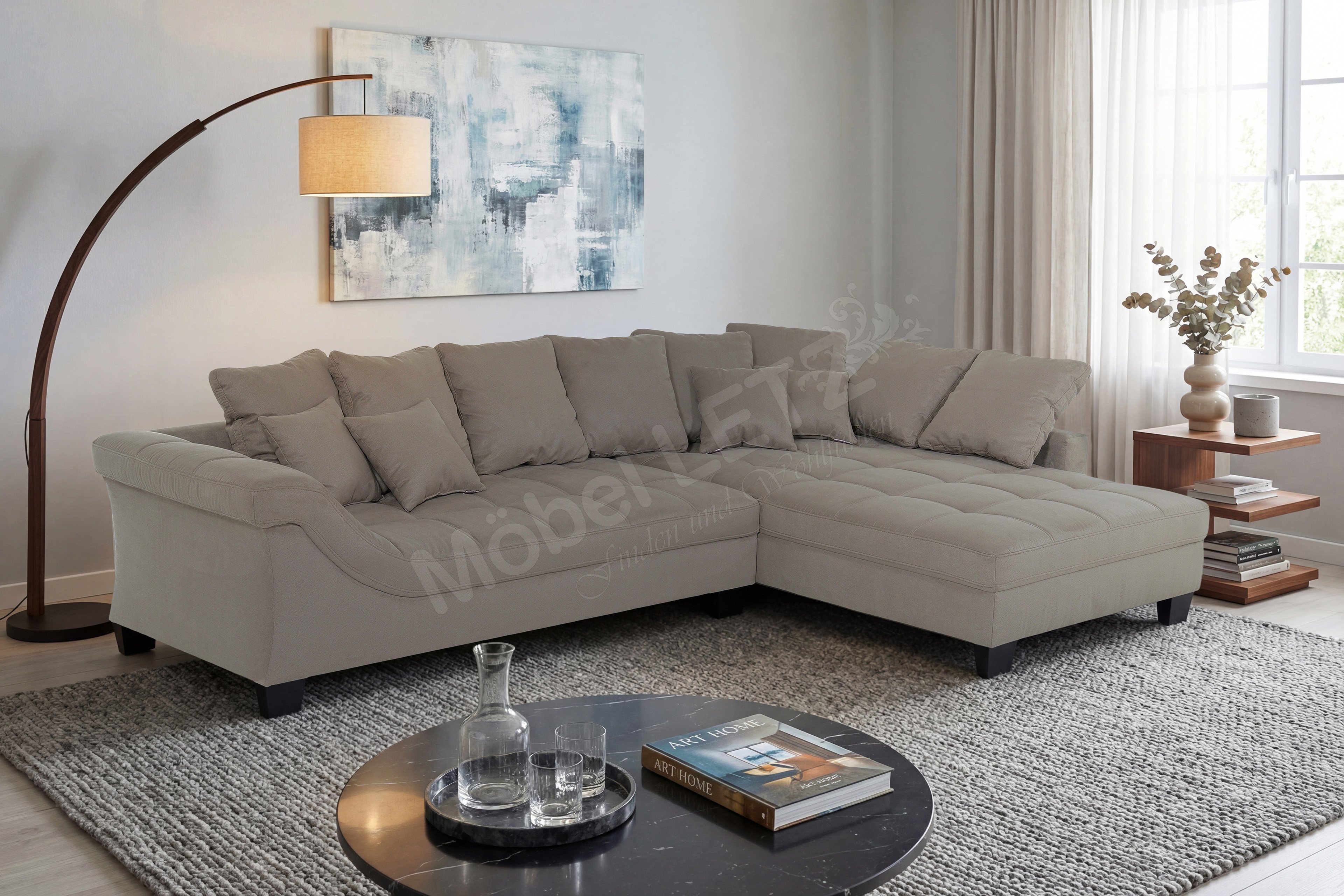 Ein Sofa ist nicht nur ein Möbelstück, sondern ein Ort, an dem jeder Moment zu einem schönen Erlebnis wird und auch ewig in Erinnerung bleibt. Die Eckgarnitur Bologna aus dem Hause Nova Via Polstermöbel lädt mit ihrem großzügigen Platzangebot sowie ihrer angenehmen Polyschaumpolsterung auf einer Wellenunterfederung zum Relaxen ein und begeistert direkt beim ersten Betrachten mit ihrem Aussehen. Der Bezug aus brauner Microfaser verleiht Ihrem Wohnzimmer einen modernen Akzent, während die inklusiven sechs Rücken-, zwei Armlehnen-, sowie vier Zierkissen eine harmonische Atmosphäre schaffen und das Gesamtbild perfekt ergänzen. In unserem Angebot zeigt sich die Nova Via Polstermöbel Garnitur mit einem Stellmaß von ca. 339 x 222 cm, sodass jeder hier sein Plätzchen findet. Hier können Sie entspannte Filme- sowie lustige Spieleabende mit der gesamten Familie erleben oder einen Nachmittagsbrunch mit der besten Freundin genießen. Bologna von Nova Via überzeugt also nicht nur mit einem himmlischen Sitzkomfort und einer ausreichenden Sitzfläche, sondern wird auch zum echten Design-Highlight in jedem Zuhause. Jetzt zu einem großartigen Preis-Leistungs-Verhältnis!