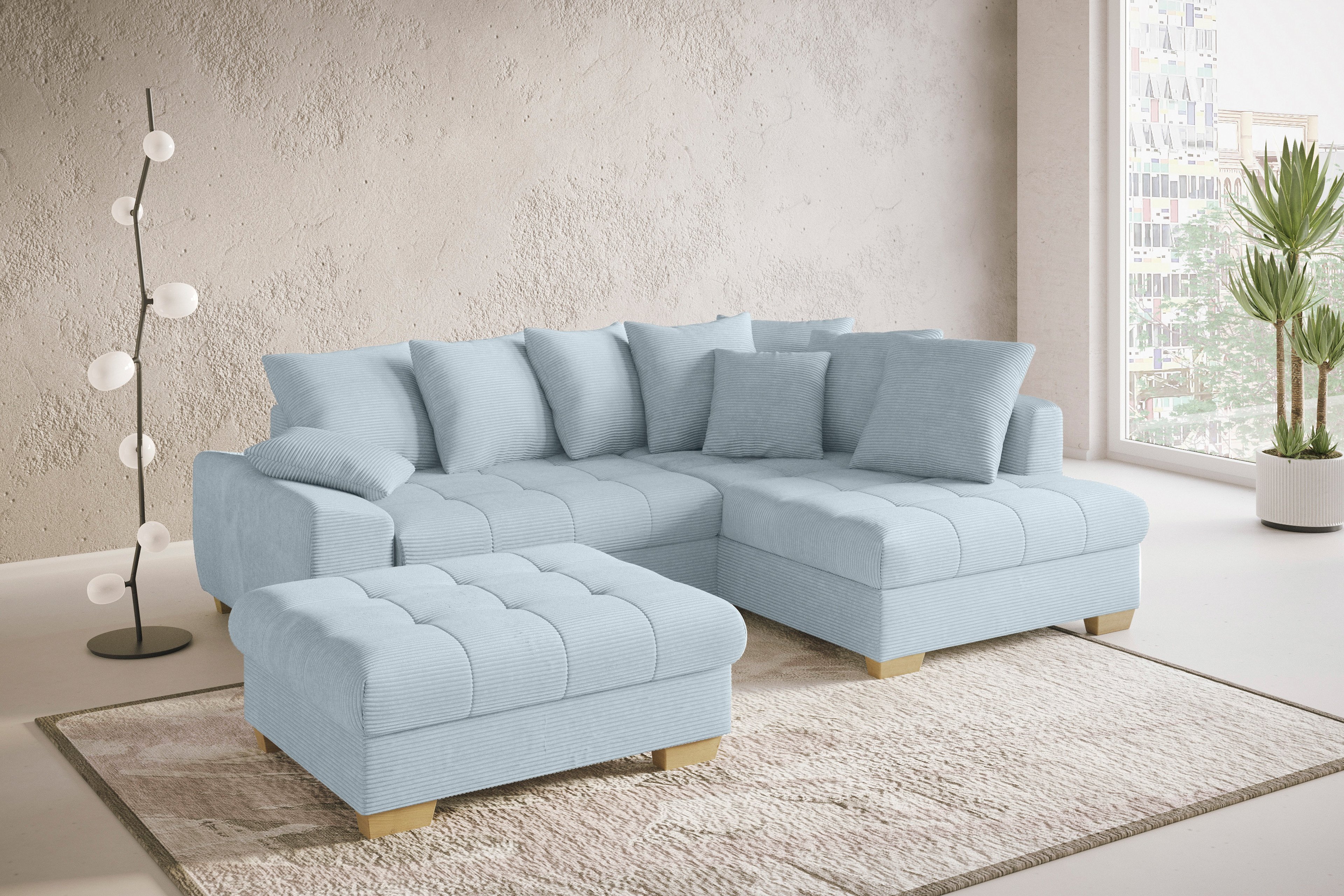 So unscheinbar das Modell Nikita II aus dem Hause Nova Via auf den ersten Blick auch sein mag, aber mit diesem Modell erhalten Sie ein modernes Ecksofa mit großartiger Funktionalität, welches sich aus einem 2-Sitzer sowie einem 3-Sitzer mit Hockerabschluss zusammensetzt und ein kompaktes Stellmaß von etwa 243 x 190 cm bereithält. Das trendige Gewand aus Microfaser in Cord-Optik, gehalten in einem kräftigen Blauton, fügt sich problemlos in jeden Einrichtungsstil ein und sorgt zudem für eine frische, natürliche Atmosphäre, die durch die eichefarbigen Holzfüße zusätzlich unterstrichen wird. Aber nicht nur optisch kann die Nova Via Polstergarnitur punkten, auch in Sachen Komfort kann Nikita II überzeugen, denn mit einer hochwertigen, formstabilen Polsterung aus Polyschaum, ruhend auf einer Wellenunterfederung, erfahren Sie ein ausgezeichnetes Sitzerlebnis, das Sie zu erholsamen Augenblicken einlädt und Ihr neues Polstermöbel garantiert schnell zu Ihrem liebsten Ort für Ruhe, Entspannung sowie Tagträume kürt. Krönen Sie das Polstersofa darüber hinaus mit einer praktischen Schlaf- sowie Stauraumfunktion, wodurch Sie eine bequeme Liegefläche von etwa 196 x 130 cm erhalten und bestens gerüstet sind für den nächsten Serienmarathon, um dabei gemütlich die Beine lang zu machen sowie die Kuscheldecke schnell aus dem Bettkasten hervorzuholen. Ebenfalls finden Sie in den Zusatzoptionen die Möglichkeit, das Sofa mit einer RGB-LED-Beleuchtung oder einem Bluetooth-Soundsystem mit Subwoofer sowie USB-Port auszustatten und das Angebot mit einem passenden Hocker harmonisch zu komplettieren. Nikita II von Nova Via Polstermöbel - Ihr neuer, persönlicher Rückzugsort.