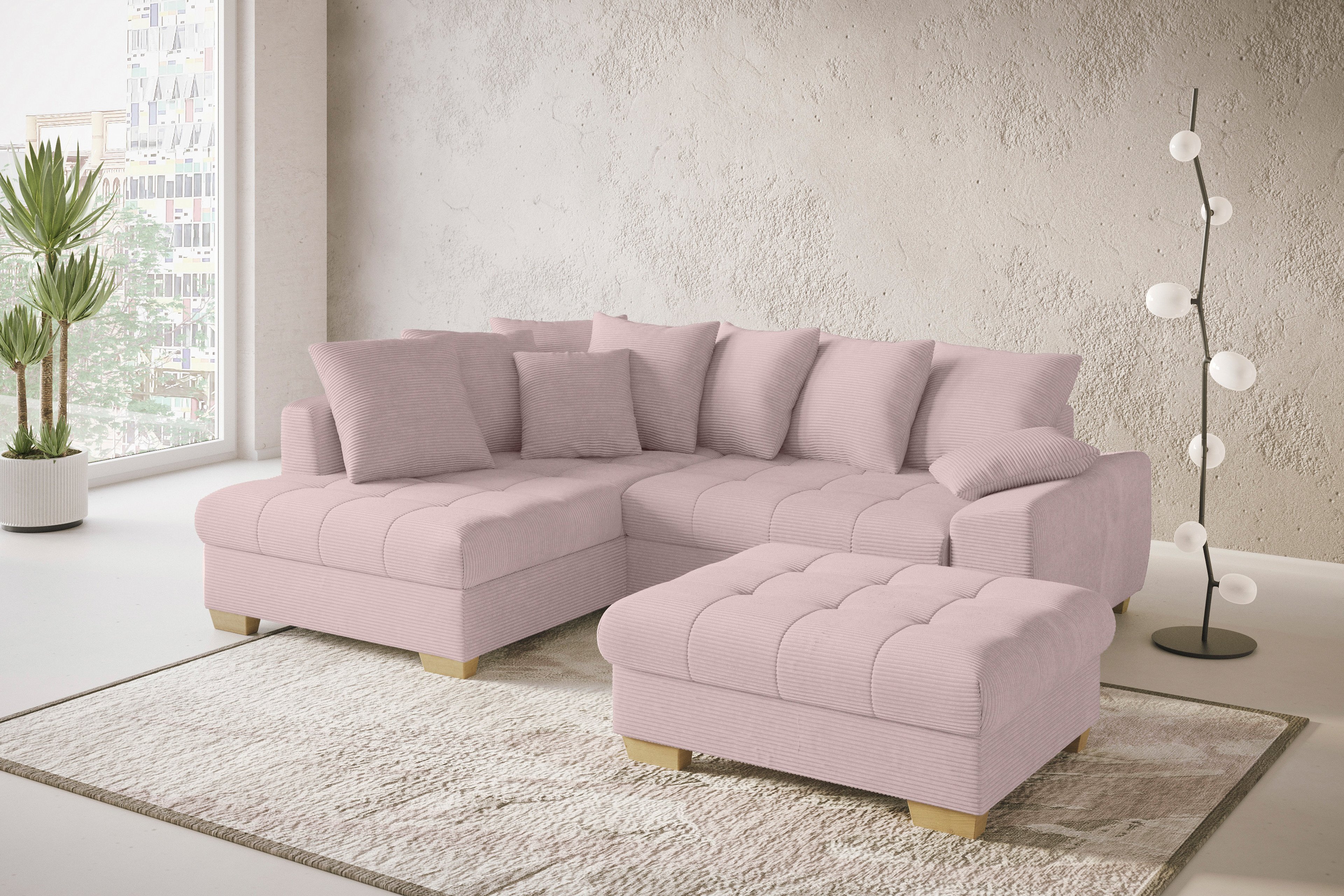 So unscheinbar das Modell Nikita II aus dem Hause Nova Via auf den ersten Blick auch sein mag, aber mit diesem Modell erhalten Sie ein modernes Ecksofa mit großartiger Funktionalität, welches sich aus einem 3-Sitzer mit Hockerabschluss sowie einem 2-Sitzer zusammensetzt und ein kompaktes Stellmaß von etwa 190 x 243 cm bereithält. Das trendige Gewand aus Microfaser in Cord-Optik, gehalten in einem kräftigen Rosaton, fügt sich problemlos in jeden Einrichtungsstil ein und sorgt zudem für eine frische, natürliche Atmosphäre, die durch die eichefarbigen Holzfüße zusätzlich unterstrichen wird. Aber nicht nur optisch kann die Nova Via Polstergarnitur punkten, auch in Sachen Komfort kann Nikita II überzeugen, denn mit einer hochwertigen, formstabilen Polsterung aus Polyschaum, ruhend auf einer Wellenunterfederung, erfahren Sie ein ausgezeichnetes Sitzerlebnis, das Sie zu erholsamen Augenblicken einlädt und Ihr neues Polstermöbel garantiert schnell zu Ihrem liebsten Ort für Ruhe, Entspannung sowie Tagträume kürt. Krönen Sie das Polstersofa darüber hinaus mit einer praktischen Schlaf- sowie Stauraumfunktion, wodurch Sie eine bequeme Liegefläche von etwa 196 x 130 cm erhalten und bestens gerüstet sind für den nächsten Serienmarathon, um dabei gemütlich die Beine lang zu machen sowie die Kuscheldecke schnell aus dem Bettkasten hervorzuholen. Ebenfalls finden Sie in den Zusatzoptionen die Möglichkeit, das Sofa mit einer RGB-LED-Beleuchtung oder einem Bluetooth-Soundsystem mit Subwoofer sowie USB-Port auszustatten und das Angebot mit einem passenden Hocker harmonisch zu komplettieren. Nikita II von Nova Via Polstermöbel - Ihr neuer, persönlicher Rückzugsort.