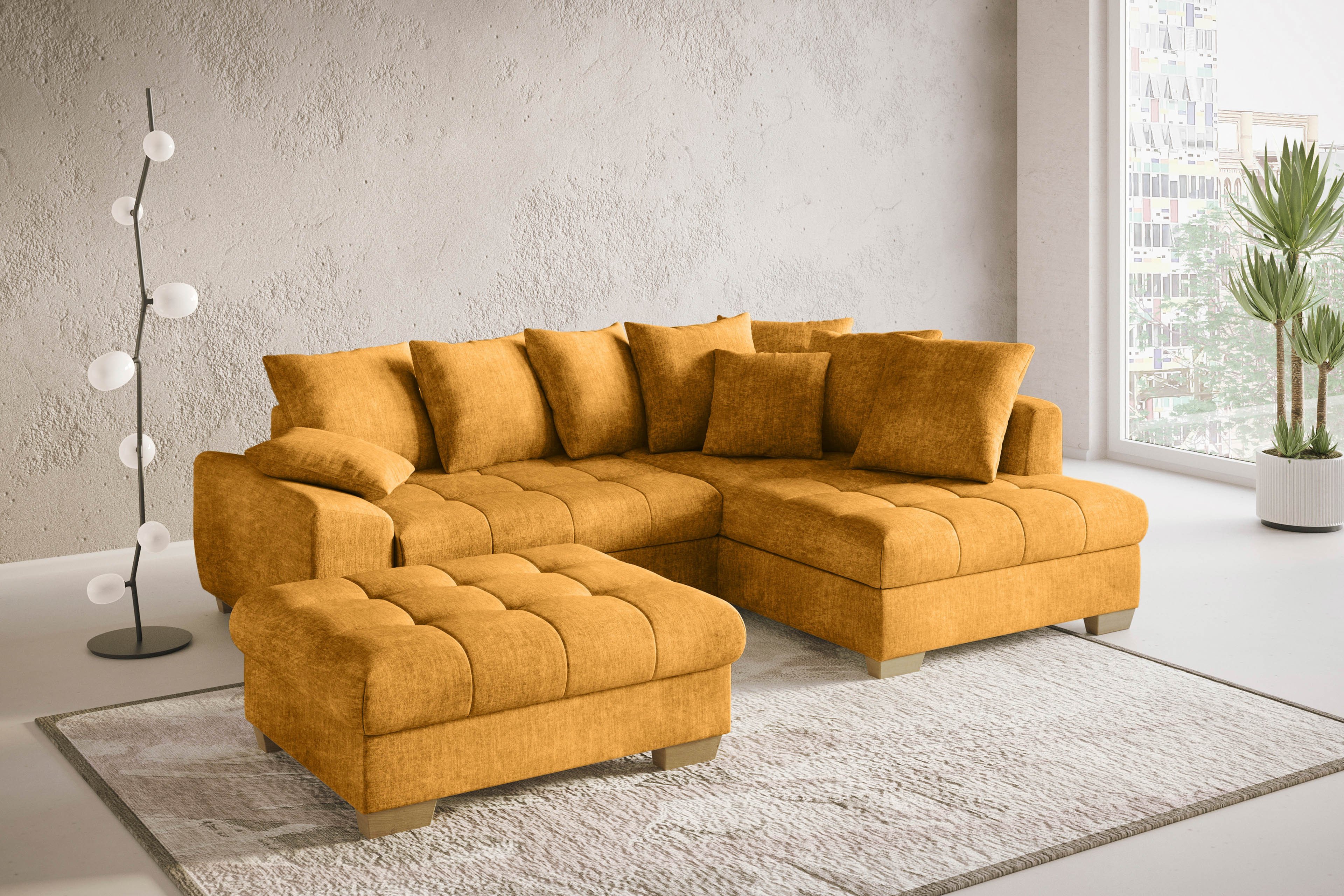 So unscheinbar das Modell Nikita II aus dem Hause Nova Via auf den ersten Blick auch sein mag, aber mit diesem Modell erhalten Sie ein modernes Ecksofa mit großartiger Funktionalität, welches sich aus einem 2-Sitzer sowie einem 3-Sitzer mit Hockerabschluss zusammensetzt und ein kompaktes Stellmaß von etwa 243 x 190 cm bereithält. Das trendige Gewand aus Microfaser, gehalten in einem kräftigen Gelbton, fügt sich problemlos in jeden Einrichtungsstil ein und sorgt zudem für eine frische, warme Atmosphäre, die durch die eichefarbigen Holzfüße zusätzlich unterstrichen wird. Aber nicht nur optisch kann die Nova Via Polstergarnitur punkten, auch in Sachen Komfort kann Nikita II überzeugen, denn mit einer hochwertigen, formstabilen Polsterung aus Polyschaum, ruhend auf einer Wellenunterfederung, erfahren Sie ein ausgezeichnetes Sitzerlebnis, das Sie zu erholsamen Augenblicken einlädt und Ihr neues Polstermöbel garantiert schnell zu Ihrem liebsten Ort für Ruhe, Entspannung sowie Tagträume kürt. Krönen Sie das Polstersofa darüber hinaus mit einer praktischen Schlaf- sowie Stauraumfunktion, wodurch Sie eine bequeme Liegefläche von etwa 196 x 130 cm erhalten und bestens gerüstet sind für den nächsten Serienmarathon, um dabei gemütlich die Beine lang zu machen sowie die Kuscheldecke schnell aus dem Bettkasten hervorzuholen. Ebenfalls finden Sie in den Zusatzoptionen die Möglichkeit, das Sofa mit einer RGB-LED-Beleuchtung oder einem Bluetooth-Soundsystem mit Subwoofer sowie USB-Port auszustatten und das Angebot mit einem passenden Hocker harmonisch zu komplettieren. Nikita II von Nova Via Polstermöbel - Ihr neuer, persönlicher Rückzugsort.