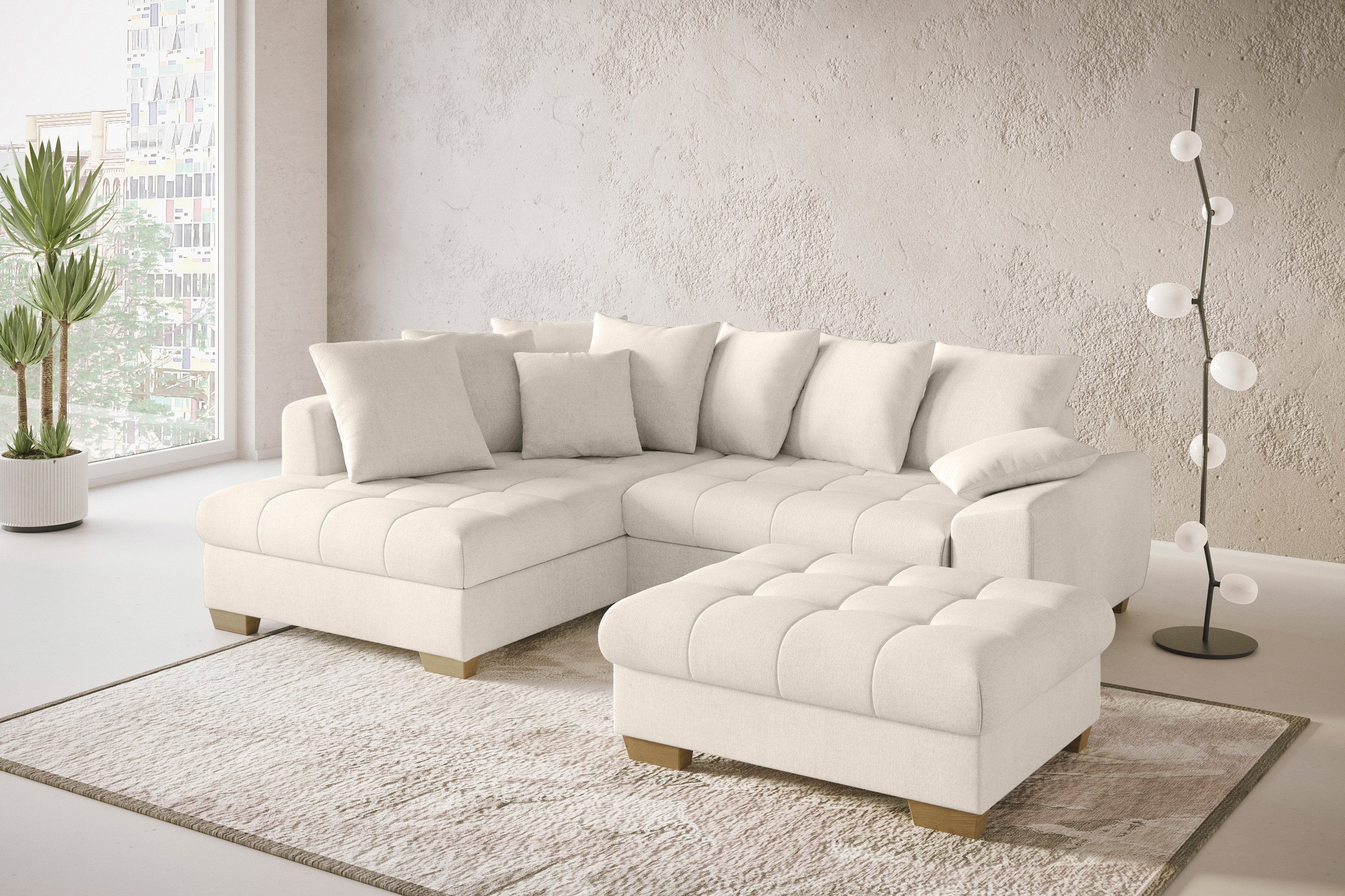 So unscheinbar das Modell Nikita II aus dem Hause Nova Via auf den ersten Blick auch sein mag, aber mit diesem Modell erhalten Sie ein modernes Ecksofa mit großartiger Funktionalität, welches sich aus einem 3-Sitzer mit Hockerabschluss sowie einem 2-Sitzer zusammensetzt und ein kompaktes Stellmaß von etwa 190 x 243 cm bereithält. Das trendige Gewand aus Chenille-Flachgewebe, gehalten in einem modernen Cremeton, fügt sich problemlos in jeden Einrichtungsstil ein und sorgt zudem für eine frische, natürliche Atmosphäre, die durch die eichefarbigen Holzfüße zusätzlich unterstrichen wird. Aber nicht nur optisch kann die Nova Via Polstergarnitur punkten, auch in Sachen Komfort kann Nikita II überzeugen, denn mit einer hochwertigen, formstabilen Polsterung aus Polyschaum, ruhend auf einer Wellenunterfederung, erfahren Sie ein ausgezeichnetes Sitzerlebnis, das Sie zu erholsamen Augenblicken einlädt und Ihr neues Polstermöbel garantiert schnell zu Ihrem liebsten Ort für Ruhe, Entspannung sowie Tagträume kürt. Krönen Sie das Polstersofa darüber hinaus mit einer praktischen Schlaf- sowie Stauraumfunktion, wodurch Sie eine bequeme Liegefläche von etwa 196 x 130 cm erhalten und bestens gerüstet sind für den nächsten Serienmarathon, um dabei gemütlich die Beine lang zu machen sowie die Kuscheldecke schnell aus dem Bettkasten hervorzuholen. Ebenfalls finden Sie in den Zusatzoptionen die Möglichkeit, das Sofa mit einer RGB-LED-Beleuchtung oder einem Bluetooth-Soundsystem mit Subwoofer sowie USB-Port auszustatten und das Angebot mit einem passenden Hocker harmonisch zu komplettieren. Nikita II von Nova Via Polstermöbel - Ihr neuer, persönlicher Rückzugsort.