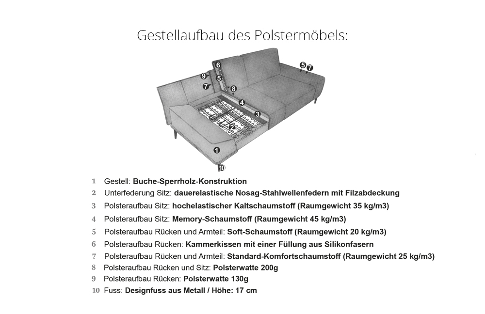 - Sitz: hochelastischer Kaltschaumstoff, Memory-Schaumstoff, dauerelastische Nosag-Stahlwellenfedern