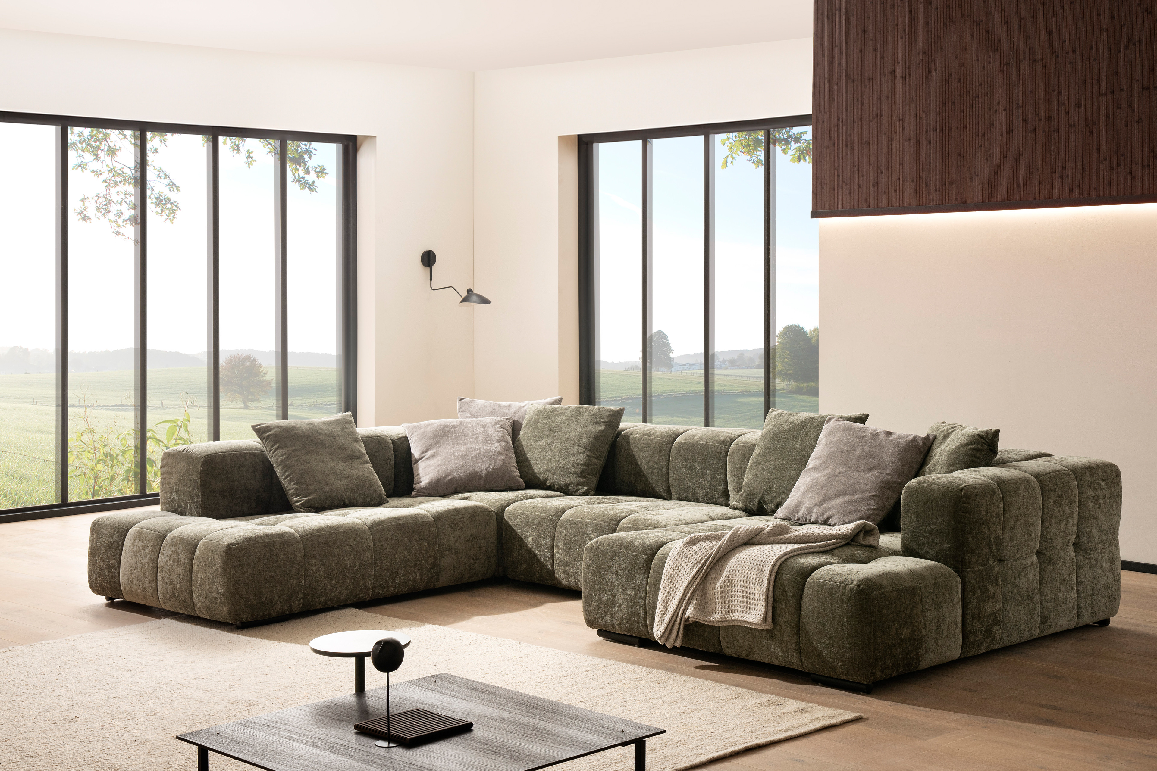 Diese großzügige Sofalandschaft ist ein echtes Highlight für weiträumige Wohnbereiche mit modernem Loft-Charakter. Das Modell Lucy-LE24 von designwerk bietet mit seiner beeindruckenden Stellfläche von ca. 255 x 349 x 169 cm erstklassigen Sitzkomfort. Die hochwertige Kaltschaumpolsterung sorgt für entspannte Fernsehabende, gemütliche Spieleabende oder einfach nur zum Abschalten nach einem langen Tag. Mit ihrem u-förmigen Design und dem strapazierfähigen Chenille-Flachgewebe, vorausgewählt im eleganten Grünton, fügt sich die Wohnlandschaft harmonisch in jeden Einrichtungsstil ein. Die wertige Verarbeitung und der angenehme Bezugsstoff machen das Sofa zu einem langlebigen Begleiter. Eine breite Bezugspalette mit wunderschönen Farbvariationen steht Ihnen unter der Rubrik "Farbe ändern" bereit. Suchen Sie sich also Ihren Favoriten mit nur wenigen Klicks ganz einfach selbst aus. Die Modell-Reihe ist variabel konfigurierbar - verschiedene Elemente können ganz nach Bedarf zusammengestellt werden. So lässt sich das Polstersofa perfekt an Ihre räumlichen Gegebenheiten und Ihren persönlichen Stil anpassen. Mit Lucy-LE24 von designwerk entscheiden Sie sich für eine Wohnlandschaft, die Design, Funktionalität sowie Wohngefühl auf höchstem Niveau vereint und Ihren Alltag mit jedem Sitzmoment ein Stück schöner macht.