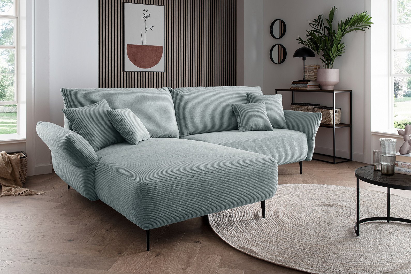 Damit das Sofa in Ihr Wohnzimmer passt, kommt es auf die richtige Größe und Form an. Kleine Sofas sind bereits mit unter 200 cm Breite erhältlich, während größere Sofas über 400 cm breit sein können. Arrangieren Sie mehrere Sofas zur Polstergruppe oder kaufen Sie mit einer 3-2-1 Garnitur eine Kombination aus Dreisitzer, Zweisitzer und Sessel. Eine Récamière, die im eigentlichen Sinne ein Sofa mit Armteilen und ohne Rückenlehne ist, erhalten Sie häufig als Abschlusselement bei Ecksofas oder Wohnlandschaften. Ein Ecksofa in L-Form oder eine Wohnlandschaft in U-Form füllen die Raumecke geschickt mit einem weiteren Sitzplatz. Bei einem Ecksofa können Sie oftmals selbst festlegen, welcher Schenkel länger ist, sodass die Couch mit den räumlichen Gegebenheiten in Ihrem Wohnzimmer harmoniert. Damit die ganze Familie Platz hat, sind Wohnlandschaften perfekt, die auch große Wohnzimmer gemütlich erscheinen lassen. Big Sofas bringen mit großzügiger Sitzfläche, üppigen Polsterungen und einladenden Formen Extra-Komfort und sind vor allem als Sofa für moderne Wohnzimmer beliebt. Viele Sofas können Sie online frei planen, um die Form und Größe der Couch selbst zu konfigurieren.