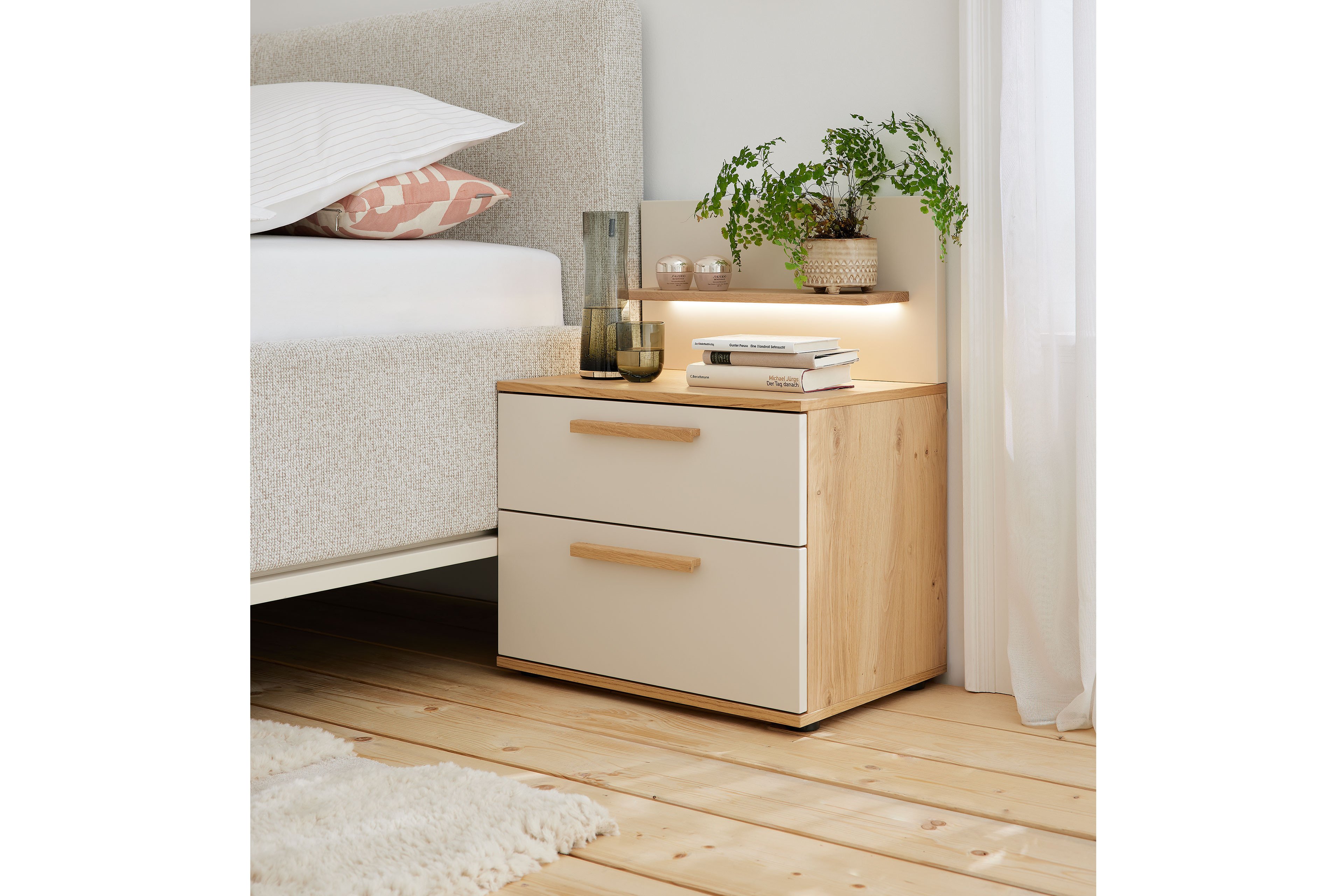 Die Nachtkonsole Montino von Musterring vereint Stil mit Qualität und schenkt Ihnen dabei nützlichen Stauraum. Ein kompakter Korpus in Balkeneiche-Furnier trifft hier auf einen eleganten Sand-Ton, der die Front schmückt. Auch ein modernes Basalt oder ein aufregendes Jungle-Green können hier neben vielen weiteren Lack-Ausführungen und einem Eiche-Furnier Ihr Möbelstück kleiden. Die zwei leichtgängigen Schubladen mit Vollauszug, Selbsteinzug und Softabstoppung bieten Platz für kleinere Wäschestücke, Ihre Nachtlektüre oder andere Gegenstände, die Sie gern bettnah aufbewahren möchten. Die höhenverstellbaren Gleitfüße können in unseren Zusatzoptionen gegen minimalistische Kufen in zwei wählbaren Varianten ausgetauscht werden, die dem Möbelstück eine fast schwebende Optik verleihen. Sie möchten Ihr gesamtes Schlafzimmer mit Montino-Möbeln gestalten, dann nutzen Sie gerne den Typenplan unter Downloads, um sich einen ersten Eindruck zu verschaffen oder kontaktieren Sie unsere freundlichen Kundenberater, die Ihnen gern hilfsbereit zur Seite stehen. Montino von Musterring – für Möbel, die perfekt in Ihr Leben passen.