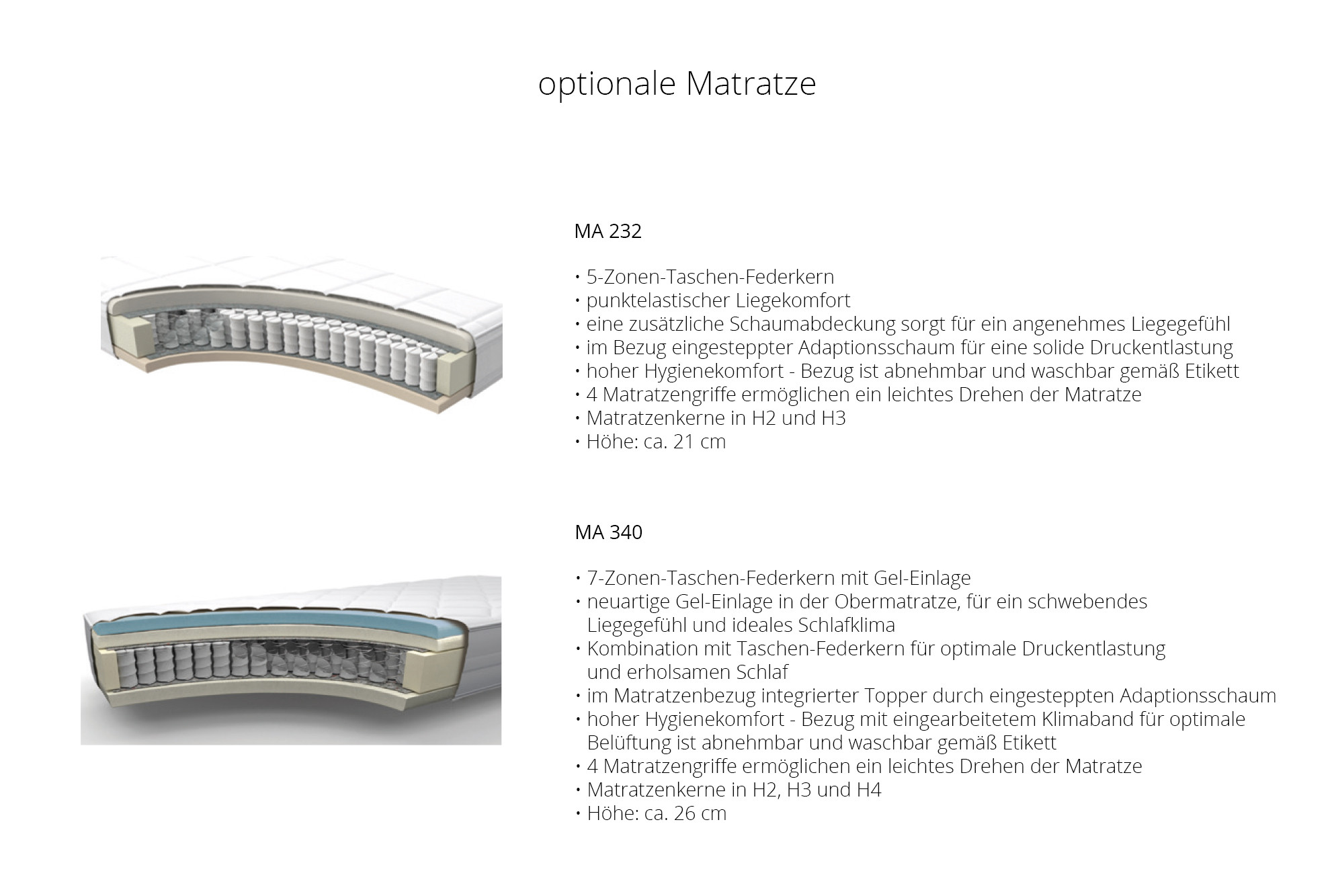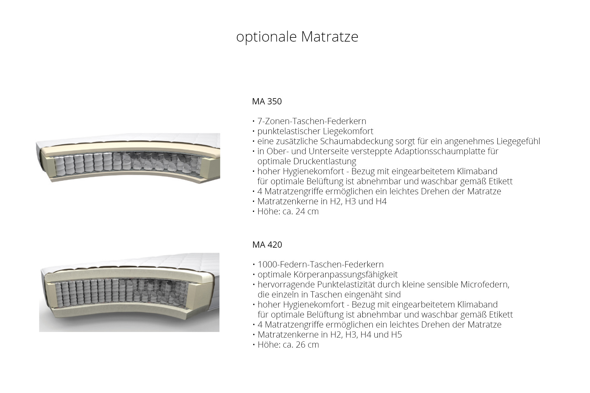Aufgrund des beidseitigen Bettkastens sind die Matratzenbezüge ab einer Liegefläche von ca. 160 x 200 cm geteilt, auf Anfrage aber auch durchgehend möglich. - optionaler Härtegrad: