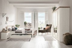 Das Schlafzimmer York aus der Kollektion set one by Musterring verkörpert zeitgemäßes, jugendliches Wohnen mit einer behaglichen, naturverbundenen Ausstrahlung. Die ansprechende Mischung aus der hellen Pino-Aurelio-Nachbildung und den schönen Akzenten in Eiche-Nelson-Nachbildung schafft eine freundliche und zugleich moderne Atmosphäre. Durch die geradlinige Gestaltung und die durchdachten Einzelheiten vereint York Wohngefühl und Designbewusstsein auf ideale Weise. Der Schrank mit vier Drehtüren, von denen zwei eine große Spiegelfläche besitzen, lässt den Raum optisch größer wirken und ist äußerst praktisch. Mit einer Innenentiefe von etwa 56 Zentimetern bietet er reichlich Platz, der dank zweier breiter Bereiche mit je einem Einlegeboden und einer Kleiderstange hervorragend organisiert ist. Die Schranktüren, die sich um 100 Grad öffnen lassen, und die stabilen Metallteile betonen die Wertigkeit und Haltbarkeit. Griffe aus Metall in mattem Nickel setzen moderne Blickpunkte und fügen sich nahtlos ins Gesamtbild ein. Die Schlafgelegenheit hat einen Bettrahmen in Pino-Aurelio der durch auffällige Randleisten in Eiche-Nelson geschmackvoll hervorgehoben. Mit einer angenehmen Kopfhöhe von ungefähr 93 Zentimetern lädt es zum gemütlichen Zurücklehnen ein, während die abgestimmten Höhen von Fußteil und Bettseiten ein ruhiges, harmonisches Aussehen gewährleisten. Vervollständigt wird die Garnitur durch den zugehörigen Nachttisch, der zwei geräumige Schubladen besitzt. Diese gleiten auf Qualitätsmetallauszügen mit sanftem Schließmechanismus und sorgen für eine geräuschlose, angenehme Handhabung. Die Deckplatte in Eiche-Nelson-Nachbildung bildet einen stilvollen Kontrast und nimmt das Design der übrigen Möbelstücke geschickt wieder auf. Mithilfe unseres Konfigurators kann das set one by Musterring Schlafzimmer York persönlich gestaltet werden und wird somit zur idealen Wahl für ein modernes, junges Zuhause mit hohen Ansprüchen an Wertigkeit und Gestaltung.