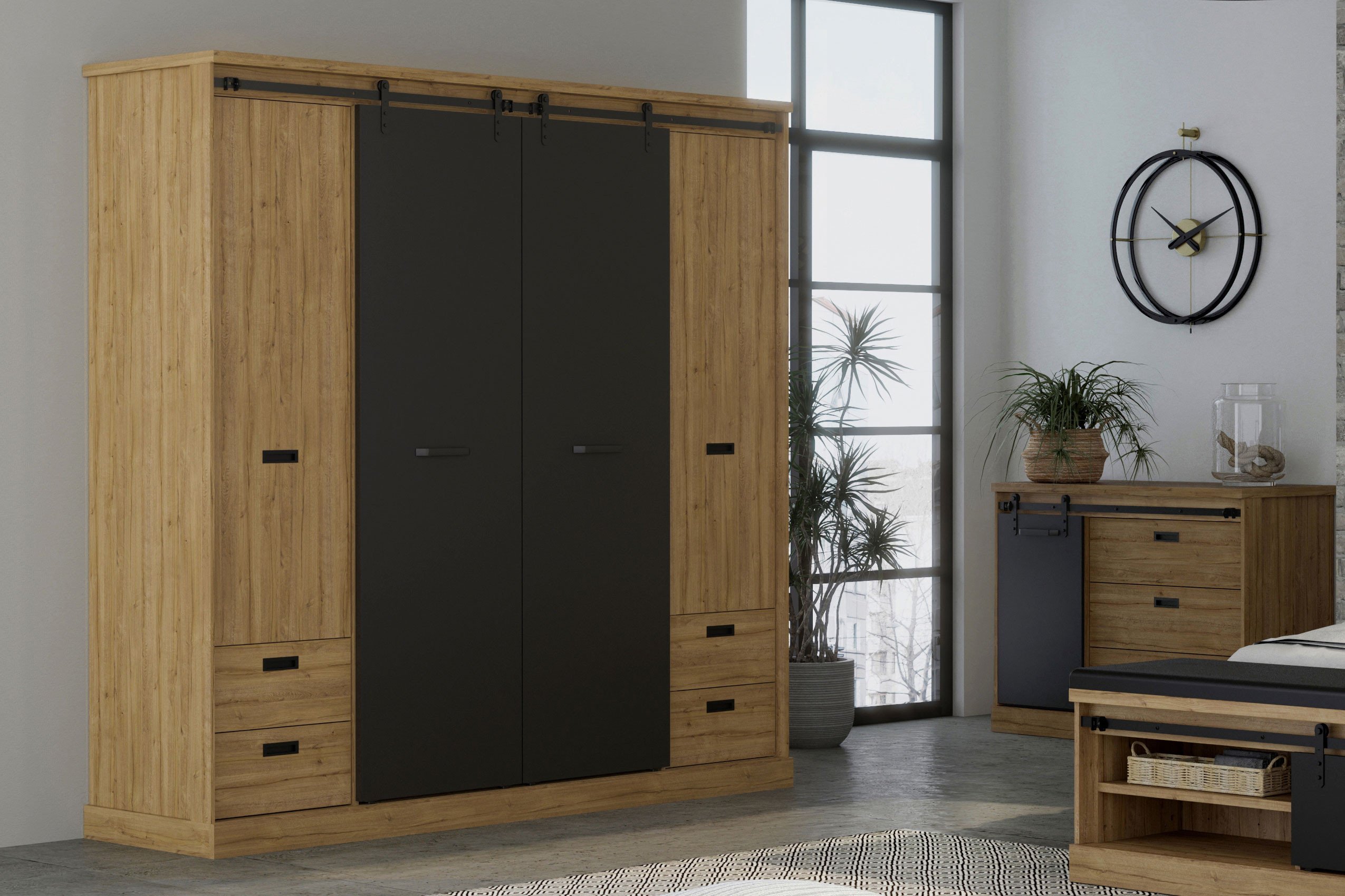 Kleiderschrank von Forte - Modell Kaszimiro - 2 Drehtüren, 2 rollengeführte Schiebetüren und 4 Schubkästen GERADLINIG. MODERN. KONTRASTREICH.