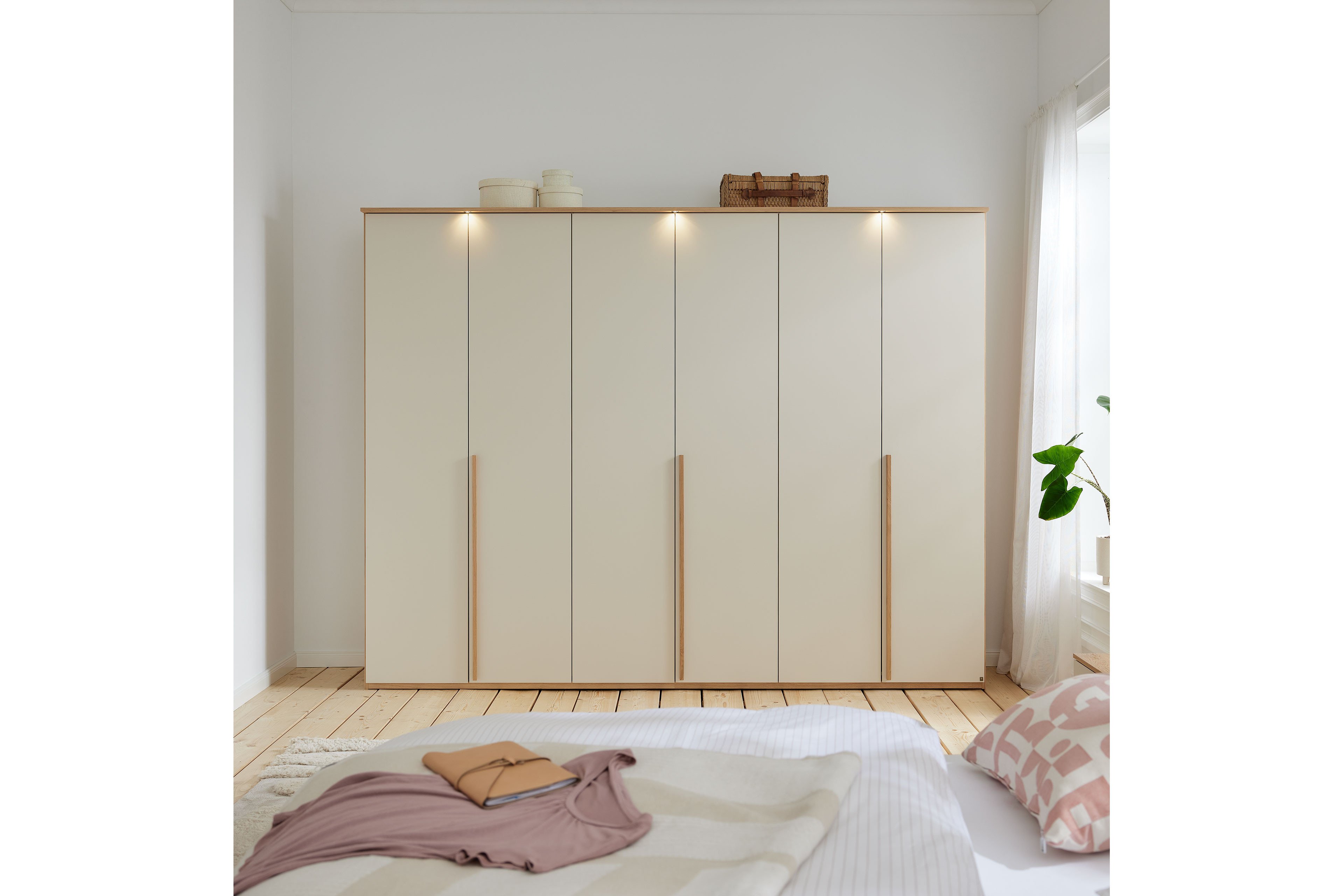 So schön war Ordnung noch nie. Der Kleiderschrank aus der Serie Montino von Musterring überzeugt mit einem puristisch-modernen Design und setzt dank der Verbindung von Balkeneiche-Furnier und sandfarbenem Lack stilvolle Akzente im Schlafzimmer. Sie können in unseren Optionen die für Sie passende Breite und Höhe auswählen. Dabei erhalten Sie stets drei Türenelemente, die insgesamt sechs Fachböden und drei Kleiderstangen enthalten. Dort gibt es natürlich noch mehr zu entdecken: zusätzliches Innenzubehör wie eine T-Einteilung, Innenschubkästen oder ein Hosenträger lassen sich dort mit nur wenigen Klicks fix ergänzen. Eine Kranzleiste kann den Look optional vervollständigen und den Schrank mit einer LED-Spot-Beleuchtung ins richtige Licht setzen. Drei elegante Griffleisten in Balkeneiche Furnier runden das natürliche Erscheinungsbild ab und gewährleisten einen komfortablen Zugang zu all Ihren Kleidungsstücken. Montino von Musterring – viel Platz für Individualität.