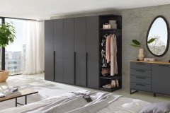 Eleganz, die heraussticht und Ihrem Schlafzimmer eine ganz neue Note verleiht. Montino von Musterring weiß mit klaren Formen und einem modernen Design zu überzeugen, das hier ganz selbstbewusst in den Vordergrund tritt. Die funktional gestaltete Schrank-Kombination besteht aus drei Schrankelementen und einem offenen Garderobenelement, das hier das Gesamtbild abrundet. Nicht nur optisch ansprechend, überzeugen hier auch die inneren Werte, die sich hinter den fünf gedämpften Türen verbergen. Mit je zwei Böden und einer Kleiderstange je Schrankabteil stehen hier bereits einige Unterbringungsmöglichkeiten für Ihre Kleidung zu Verfügung. Sie wollen das Grundangebot mit zusätzlichem Zubehör erweitern? In unseren Zusatzoptionen finden Sie nicht nur weitere Böden, eine T-Einteilung oder auch Innenschubkästen. Dort können Sie auch die abgebildete Aufsatzbeleuchtung hinzufügen und Ihren individuellen Kleiderschrank gestalten. Breite, Höhe, Korpus, Front und sogar die Griffe sind ebenfalls anpassbar. Montino von Musterring – für Orte der Gelassenheit.