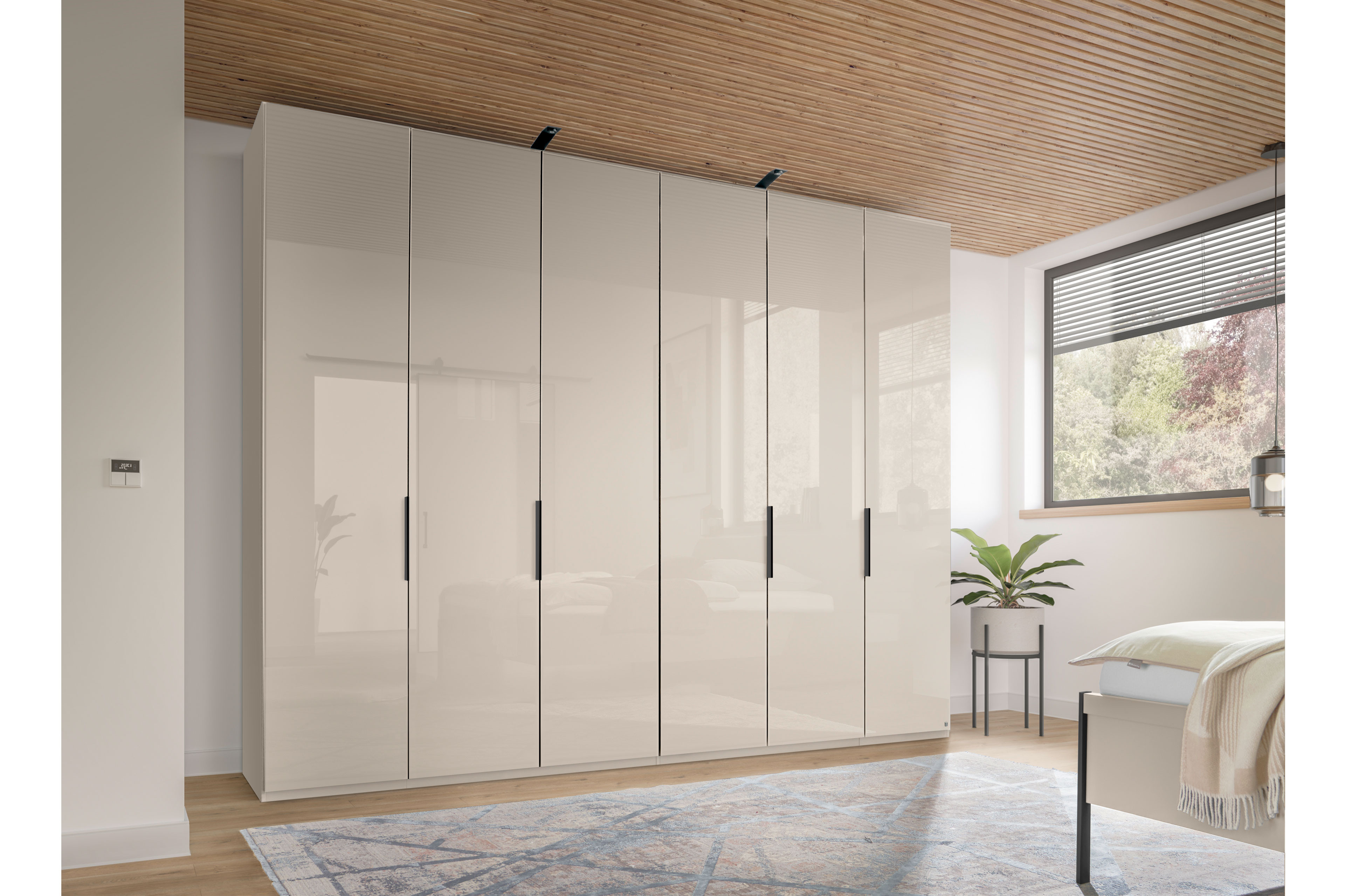 - Drehtüren mit 105°-Öffnungswinkel und gedämpften Scharnieren (bei Schrankhöhe ca. 236 cm vier Scharniere je Tür)