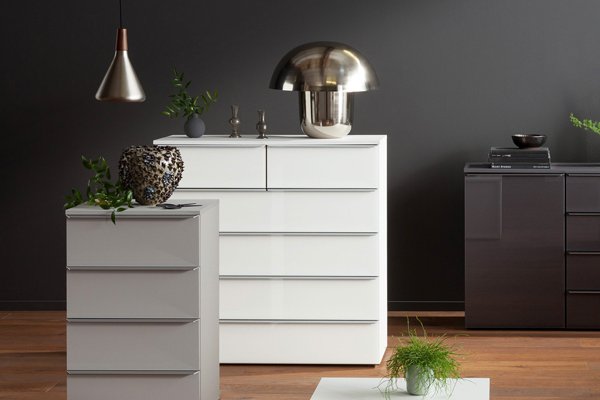Zur Grundausstattung im Schlafzimmer gehört neben dem Bett ein Kleiderschrank, um die Kleidung wohl sortiert unterzubringen und die Ordnung im Schlafzimmer zu bewahren. Klassiker ist der Drehtürenschrank, der entweder als schmaler Zweitürer für das Single-Schlafzimmer oder als großer Kleiderschrank mit sechs oder mehr Türen auftritt. Neben Drehtürenschränken gibt es die Schlafzimmermöbel mit Falttüren, Schiebetüren oder Schwebetüren. Wenn Sie Unterwäsche oder Socken im Schlafzimmerschrank unterbringen möchten, sind Kleiderschränke mit zusätzlichen Schubladen sinnvoll. Alternativ kann eine Wäschekommode diese Funktion im Schlafzimmer übernehmen. Eine zum Kleiderschrank passende Schlafzimmerkommode lockert den Raum auf und lässt oberhalb Freifläche für einen Spiegel oder ein dekoratives Wandbild genügend Platz. Optisch verzaubern einerseits Kleiderschränke aus Massivholz mit dem natürlichen Charme von echtem Holz; andererseits sorgen Schränke mit modernen Hochglanz für einen gelungenen Hingucker. Zudem sorgen Schlafzimmermöbel in kräftigen Trendfarben oder im Materialmix für ein Highlight im Schlafgemach. Damit Sie sich bequem im Schlafzimmer ankleiden können, eignen sich Kleiderschränke mit Spiegel, der entweder in die Schrankfront integriert oder als Innenspiegel konzipiert ist. Noch komfortabler wird das Ankleiden mit einer Beleuchtung am Schrank, die gleichzeitig für ein angenehmes Licht am Abend sorgt. Viele Schränke bei Möbel Letz überlassen Ihnen großzügigen Freiraum zur individuellen Gestaltung. Strukturieren Sie den Innenraum etwa mit weiteren Fachböden, einem Schubkasteneinsatz, Krawattenhalter oder Kleiderlift.