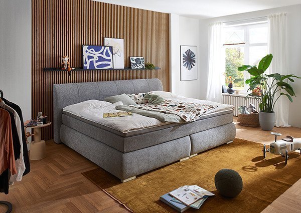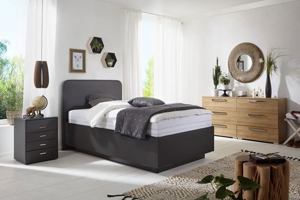Damit Sie gut erholt in den Tag starten, sollte das Bett im Schlafzimmer auf Sie und Ihre Schlafgewohnheiten zugeschnitten sein. Bedienen Sie sich dazu aus unserer Vielfalt an Bettgestellen, Lattenrosten und Matratzen. Die Größe der Liegefläche reicht von 90 x 200 cm bei klassischen Einzelbetten über 140 x 200 cm bei Queensize-Betten bis hin zu Doppelbetten mit 180 x 200 cm. Darüber hinaus sind viele Betten mit individueller Liegeflächengröße, beispielweise in Überlänge, verfügbar. Sie haben außerdem die Wahl zwischen verschiedenen Materialien für das Bettgestell. Massivholzbetten bringen optisch und haptisch die schönsten Seiten der Natur in Ihr Schlafzimmer. Bei geöltem oder gewachstem Holz bleibt die offenporige Oberfläche erhalten, sodass sich die Schlafzimmermöbel nebenbei positiv auf das Raumklima auswirken. Modern elegant wirken Polsterbetten, bei denen die Ästhetik auf weichen Polsterelementen beruht. Sowohl Bettrahmen als auch Kopfteil sind beim Polsterbett weich gepolstert und mit edlen Bezügen umhüllt. Mal romantisch verspielt, mal puristisch mit geradlinigen Formen treten Metallbetten auf. Neben Betten mit komplettem Metallgestell gibt es die langlebigen Schlafmöbel mit Polsterungen oder Holzelementen. Boxspringbetten beeindrucken mit prachtvollem Charakter, der durch die erhöhte Liegefläche, das ausdrucksstarke Kopfteil sowie elegante Füße und Bezüge entsteht. Den Lattenrost ersetzt bei einem Boxspringbett ein stabiles Holzgestell mit Unterfederung. Darauf folgen Obermatratze und Topper beim skandinavischen Boxspringbett. Eine optionale motorische Relaxfunktion toppt den Komfort im Schlafzimmer noch. Für ältere Menschen eignen sich Boxspringbetten im Schlafzimmer übrigens auch, denn bei einem Seniorenbett ist vor allem eine Mindesthöhe der Liegefläche von ca. 50 cm wichtig.