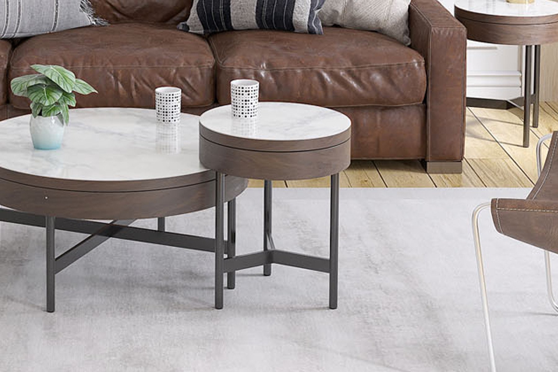Ein Beistelltisch ist nicht nur eine praktische Abstellfläche für kleine Snacks oder ein Gläschen Wein, sondern wird vielmehr zum Highlight in Ihrer Sofaecke. Mit Kingston von Akante setzen Sie ein effektvolles Statement im Wohnzimmer, welches Ihre Familie und Ihre Gäste gleichermaßen beeindrucken wird. Die Tischplatte des runden Beistelltisches besteht aus Keramik in Marmoroptik und der Korpus aus Nussbaumfurnier. Die filigranen Tischbeine sind aus schwarz pulverbeschichtetem Edelstahl. So entsteht ein stilvoller Mix aus verschiedenen Materialien, die am Ende ein harmonisches Gesamtbild ergeben. Des Weiteren hat Kingston noch ein interessantes Highlight zu bieten, denn seine Tischplatte ist schwenkbar und gibt im Inneren wertvollen Stauraum für Fernbedienung oder Zeitschriften frei. Kingston von Akante - innovative und zeitgenössische Designmöbel.