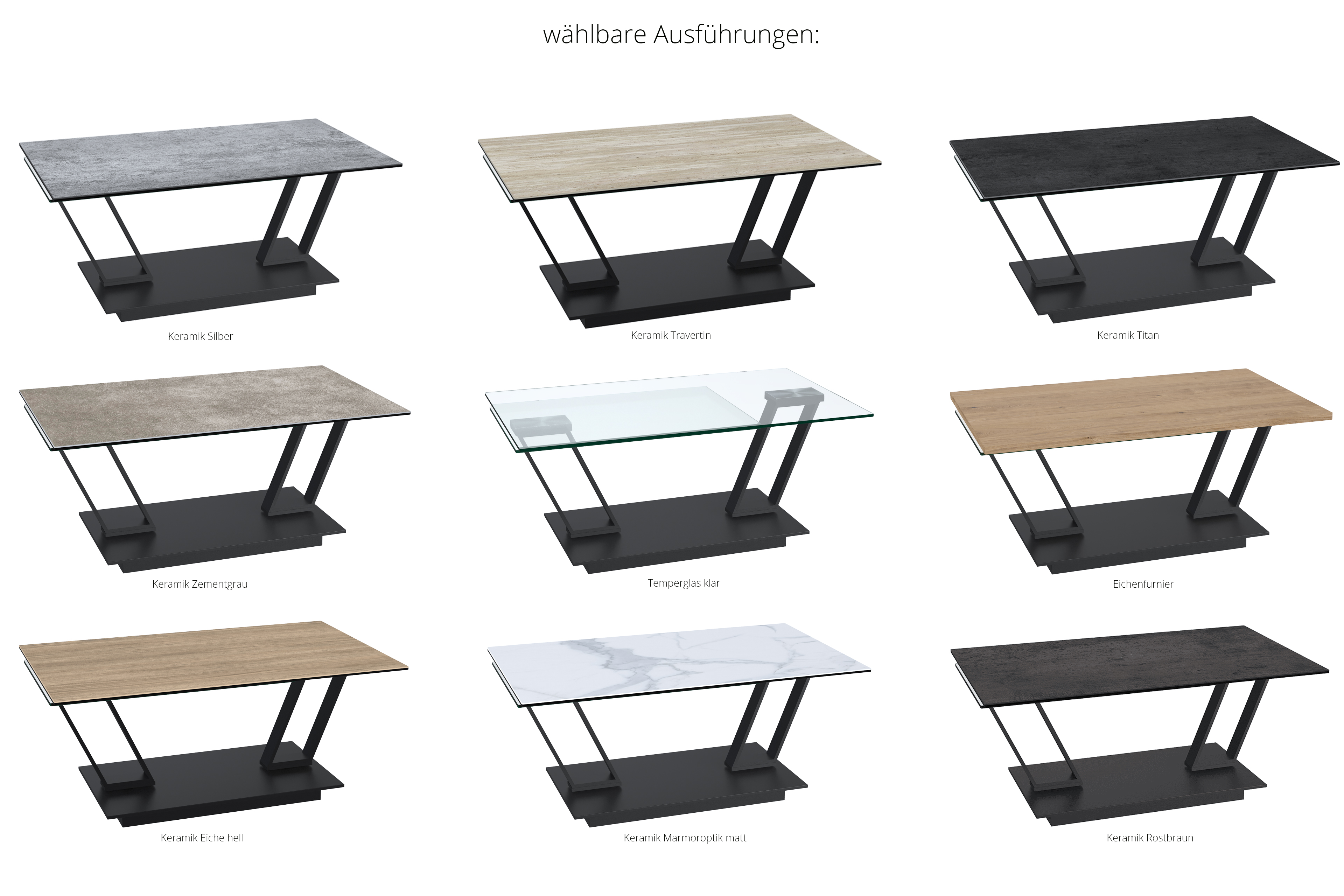 - obere Tischplatte: Keramik Silver (ca. 3 mm) auf Temperglas, klar (ca. 6 mm)