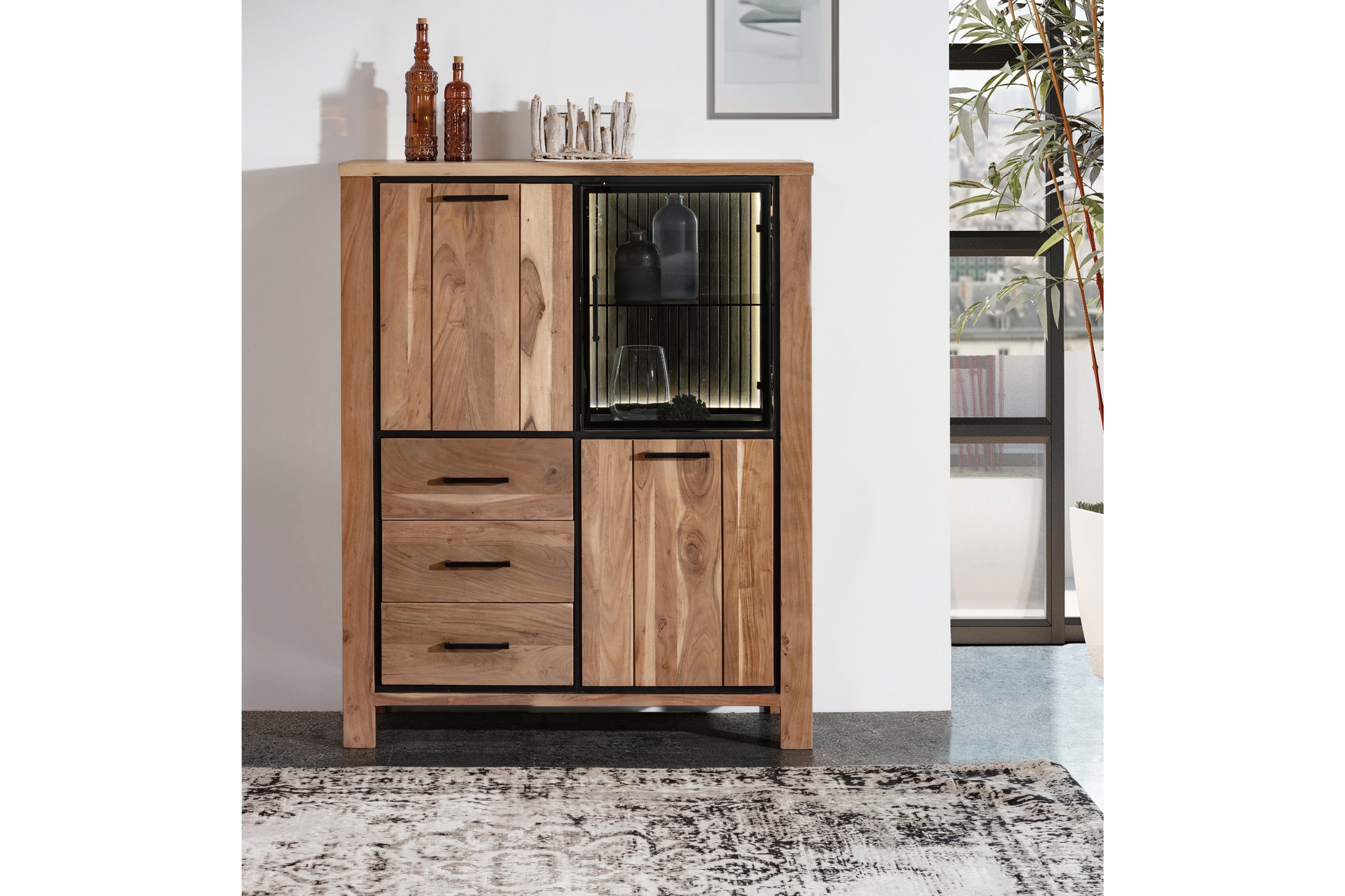 - Highboard mit 2 Holztüren, 1 Glastür, 2 Konstruktionsböden, 1 Glaseinlegeboden und 3 Schubkästen