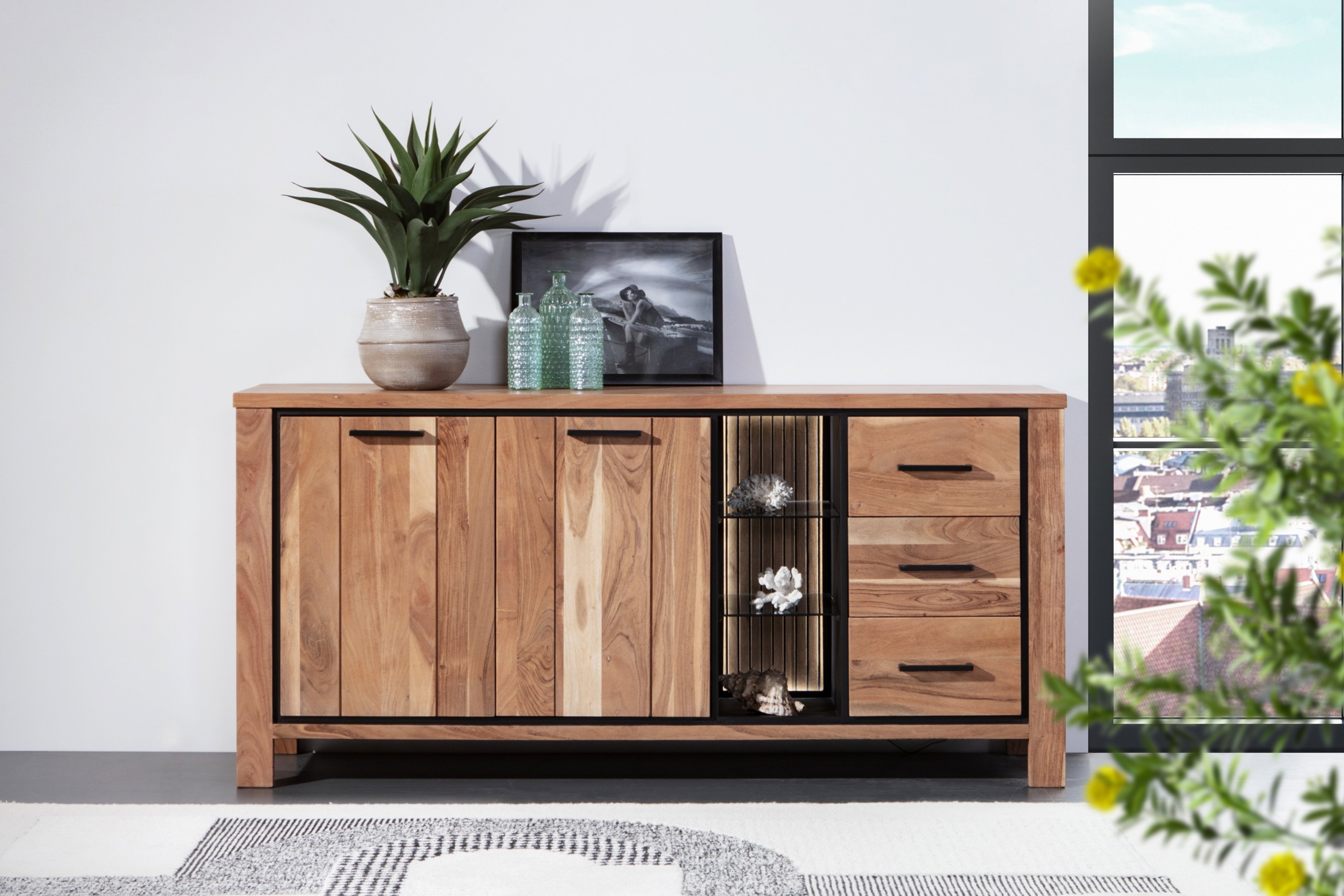 Mit GUTMANN erleben Sie die Möbeltrends aus aller Welt. Das Sideboard aus der Modellreihe Akazio ist ein Möbelstück, das Wärme, Charakter und Eleganz in Ihr Zuhause bringt. Die Kombination aus massivem Akazienholz und Echtholzfurnier verleiht dem Solisten eine natürliche Ausstrahlung. Eine sichtbare Rückwand in Lamellen-Optik rundet das hochwertige Design stilvoll ab und sorgt so auch für einen wahren Blickfang. Auch die funktionale Seite des Möbels überzeugt: Hinter zwei Holztüren mit integrierten Softclose-Beschlägen verbergen sich großzügige Ablageflächen, um Ihre persönlichen Sachen außerhalb des Sichtbereichs unterzubringen. Ein offenes Fach mit Alu-Rahmen und zwei Glaseinlegeböden aus Rauchglas bietet nicht nur stilvolle Präsentationsmöglichkeiten Ihrer dekorativen Elemente, sondern setzt auch moderne Akzente. Drei Schubkästen auf stabilen Metalllaufleisten bieten zudem weiteren Platz für diverse Alltagsutensilien. Des Weiteren sorgt eine integrierte Rückwandbeleuchtung für stimmungsvolles Licht und hebt die Struktur des Holzes ebenso hervor wie Ihre Lieblingsstücke. Ob als stilvoller Solitär oder kombiniert mit weiteren Möbeln aus der Kollektion Akazio – dieses Sideboard vereint Natürlichkeit, Funktionalität und Design auf höchstem Niveau.