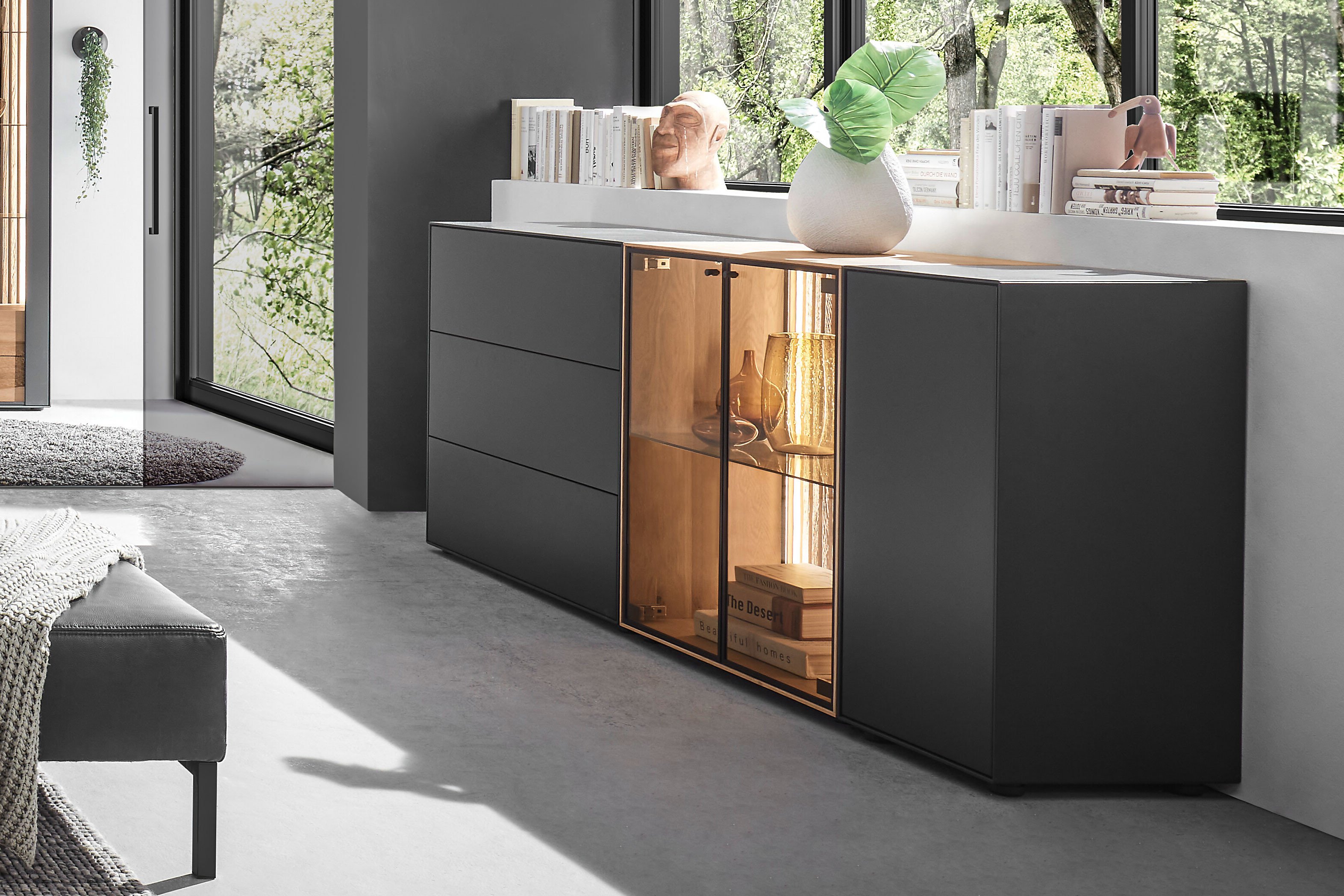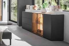 Dieses Sideboard von Hartmann ist ein Statement für höchste Möbelkultur – 100 % Made in Germany. Es vereint handwerkliche Perfektion, durchdachte Funktionalität und ein Design, das auf den ersten Blick begeistert. Der raffinierte Materialmix aus edler, anthrazit lackierter Birke, warmem Eichenholz und feinen Metallakzenten verleiht dem Möbelstück seinen unverwechselbaren Charakter. Unterschiedliche Öffnungsmechanismen – eine Holztür sowie Schubkästen mit Push-Pull-Funktion und Glastüren mit Metallgriffen – machen diese Kommode nicht nur optisch spannend, sondern auch in der Handhabung komfortabel und modern. Hinter den Glastüren setzt eine Lamellenrückwand aus massiver Eiche eindrucksvolle Akzente. Das warme, strukturierte Holz bildet einen faszinierenden Kontrast zur kühlen, anthrazitfarbenen Front und schafft Tiefe und Atmosphäre. Das zweifarbige Deckblatt rundet das harmonische Gesamtbild ab und unterstreicht den hochwertigen Charakter dieses Designmöbels. Ein Möbel mit Persönlichkeit – präzise gefertigt, ausdrucksstark im Auftritt und ein echtes Highlight für alle, die Wert auf Stil, Qualität und Raffinesse legen. Selino – begeisternd schön.