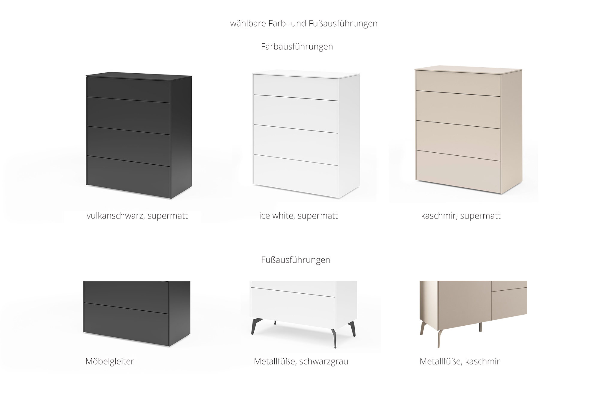 Das abgebildete Sideboard von set one by Musterring bietet vielfältige Anpassungsmöglichkeiten. Dieses Möbel aus der Modellreihe Riverside ist in drei verschiedenen Farbausführungen erhältlich: Sie haben die Wahl zwischen einem klassischen Weiß, einem modernen Kaschmir oder einem eleganten Schwarz. Zudem haben Sie die Möglichkeit, das Möbelstück entweder mit Metallfüße oder mit Möbelgleiter zu gestalten. Außerdem ist der Solist auch ein wahrer Stauraumakrobat, denn hinter einer Tür sowie in den vier Schubkästen verbirgt sich ausreichend Platz, um Ihre verschiedenen Utensilien unterzubringen. Für ein sanftes und leises Schließen sorgen Ihnen die integrierten Softclose-Funktionen. Weiterhin haben wir für Sie einen Möbelplaner hinterlegt, in welchen Sie alle verfügbaren Ausführungen sowie alle erhältlichen Einzelmöbel der Produktreihe Riverside finden. Überzeugen Sie sich selbst von den Möbeln von set one by Musterring und gestalten sie sich Ihre Wohnbereiche ganz nach Ihren Vorstellungen.
