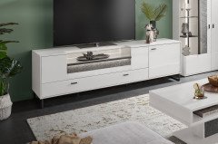 - Lowboard mit 1 Holztür, 1 Klappe (oben) mit Glasausschnitten (Front und Deckblatt), 1 Doppelschubkasten und 1 Einlegeboden