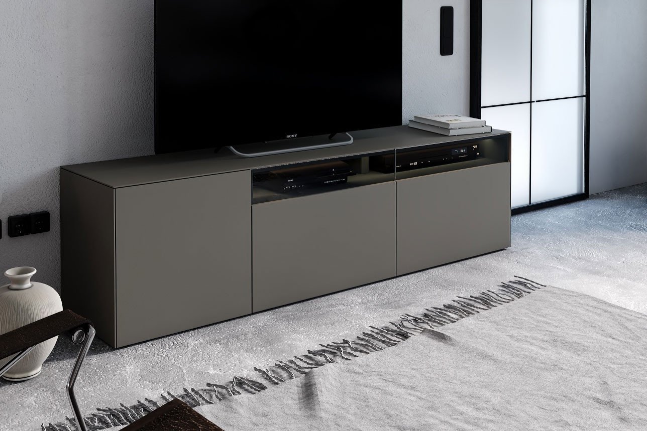 TV-Lowboard: in verschiedenen Ausführungen von spartanisch bis pompös, für Fernseher, Equipment und Zubehör, teils mit speziellem Soundsystem versehen