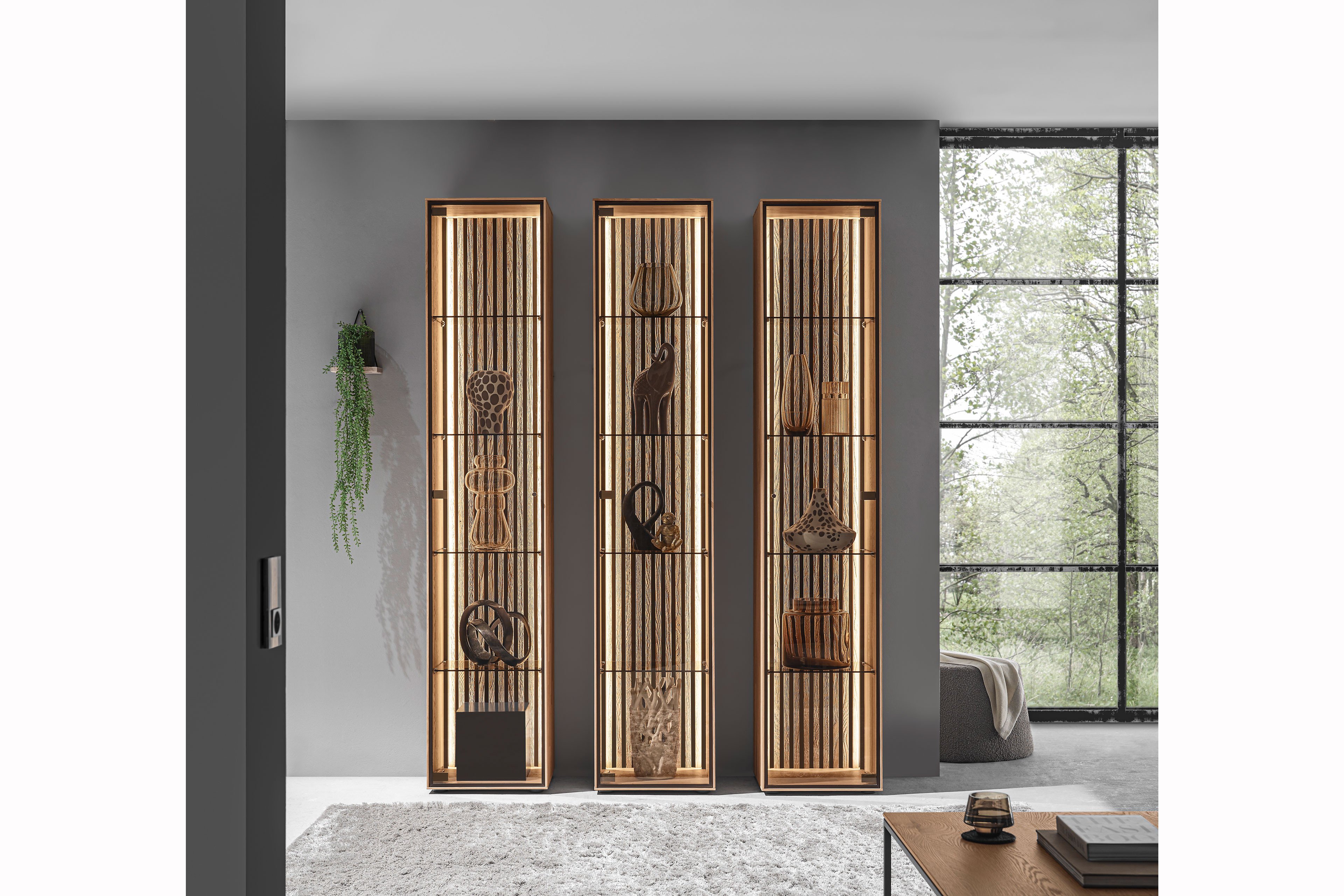 Eleganz in Holz und Glas – dies verkörpert die hier abgebildete hochwertige Standvitrine aus der Modellreihe Selino aus den Hartmann Möbelwerken. Das Möbel überzeugt durch ein klares Design und der Verarbeitung edler Materialien. Der massive Holzkorpus gibt dem Solisten Stabilität und sorgt für eine warme, natürliche Ausstrahlung. Eine elegante Glastür mit Metallgriff ermöglicht den freien Blick auf den Innenraum und schützt Ihre Lieblingsstücke gleichzeitig vor Staub und Beschädigung. Im Inneren sorgen fünf fein gearbeitete Glasböden für eine strukturierte Präsentationsfläche – ideal für Dekoration, Bücher, Kunstobjekte oder Sammlerstücke. Ein besonderes Highlight stellt die im Hintergrund sichtbare Lamellenrückwand dar, die mit ihrer Struktur dem Gesamtbild Tiefe und Charakter verleiht. Buchen Sie optional die passende Beleuchtung hinzu und erleben Sie ein meisterhaftes Lichtspiel hinter Glas, welches Sie nicht verpassen dürfen. Wer das Gesamtbild abrunden möchte, ergänzt die Standsäule durch eine zweite oder sogar dritte Einheit. Als Ensemble arrangiert, entsteht eine harmonische Gruppe, die sich sowohl symmetrisch als auch frei kombinieren lässt – etwa links und rechts eines Sideboards, als stilvolle Begrenzung eines offenen Raumes oder als dekorative Vitrine entlang einer Wand. Ob einzeln oder im Trio – jedes Element bleibt ein Blickfang für sich und bringt Klarheit, Stil und wohnliche Wärme in jeden Raum.