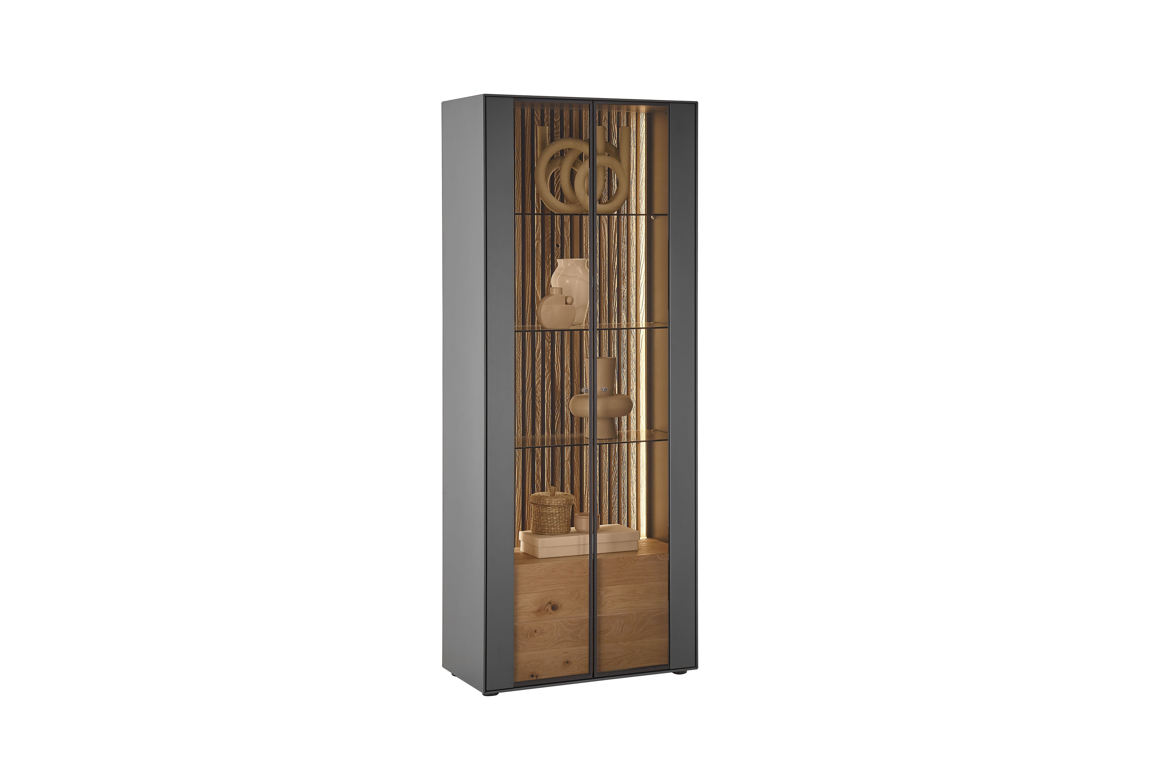 Vitrine von Hartmann - Modell Selino Kerneiche natur/ Birke anthrazit gebeizt  Selino - Naturschauspiel aus Massivholz und Lack