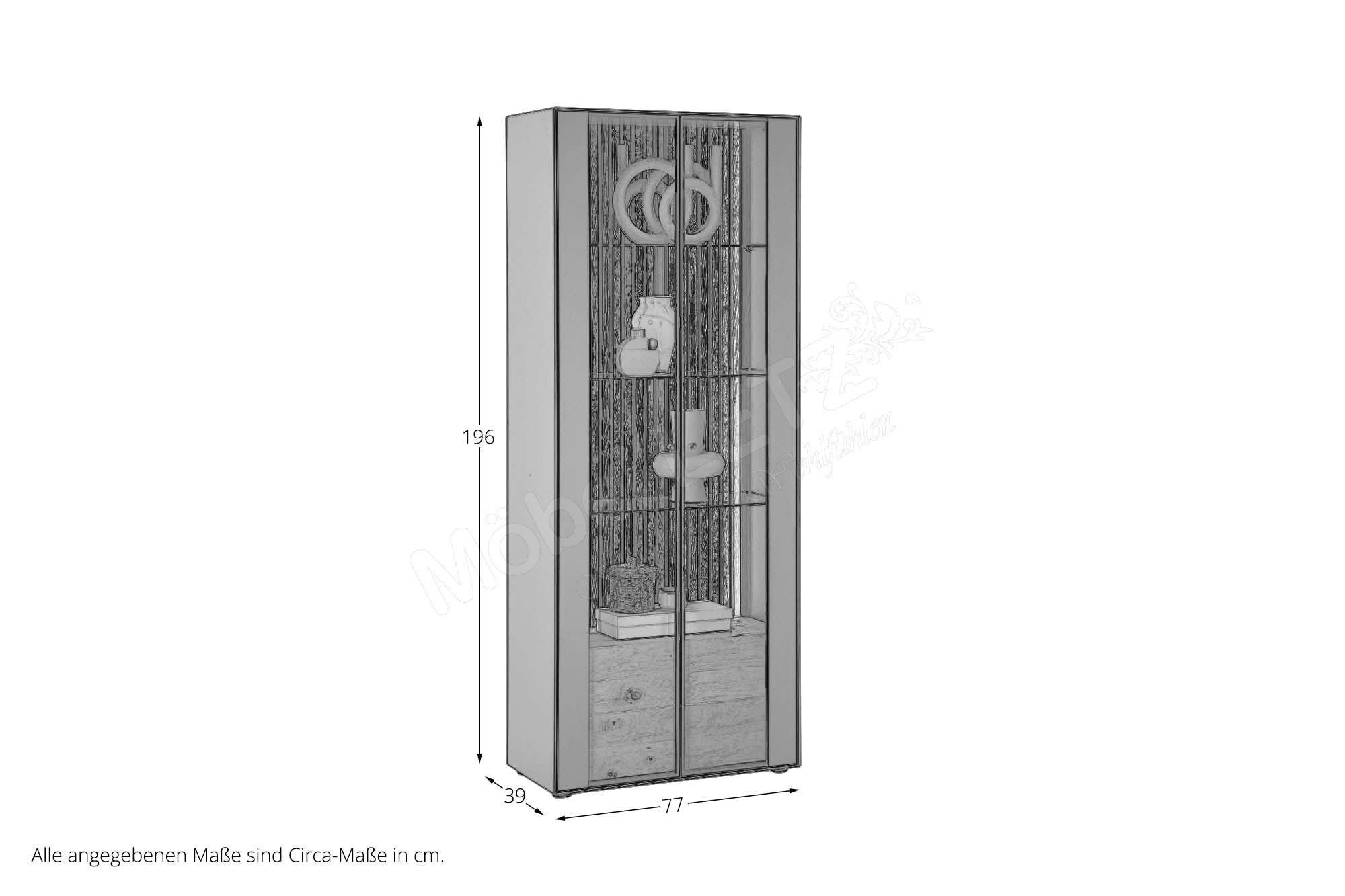 - Vitrine mit 2 Glas-/ Holztüren, 3 Glasböden, 1 Holzboden, 2 Schubkästen und 1 Lamellenrückwand
