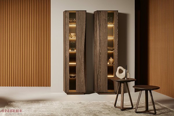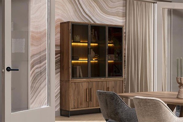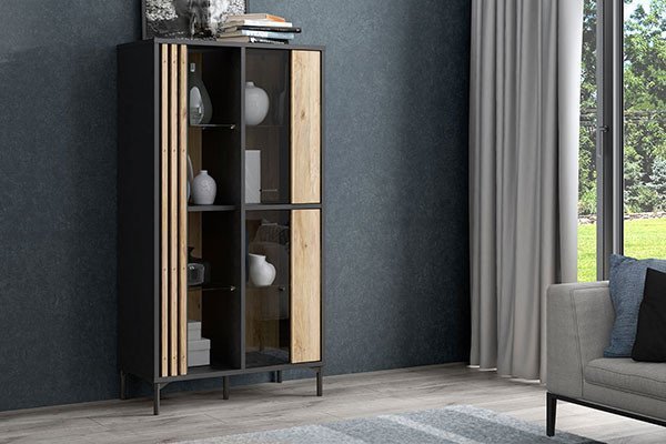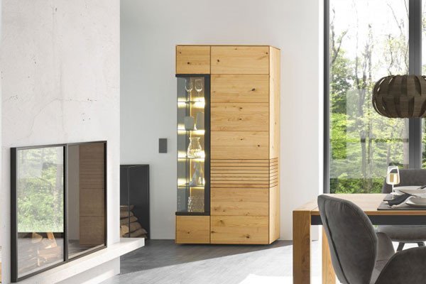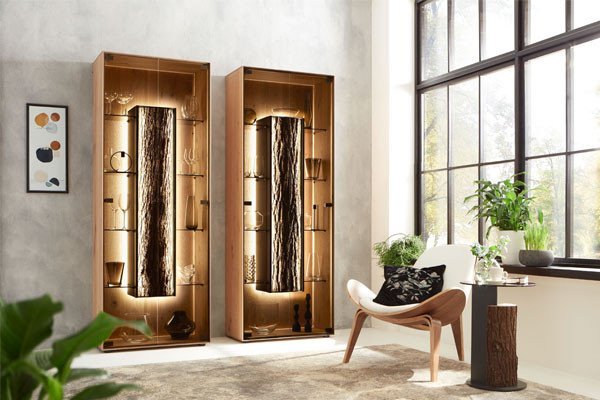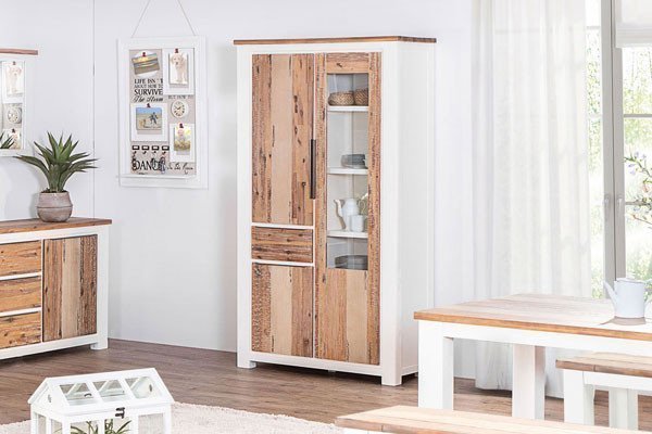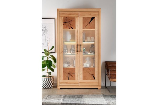 Einen gelungenen Kompromiss zwischen geschlossenen und transparenten Elementen stellen die Vitrinen dar, bei denen die Glasscheiben in unterschiedlichem Verhältnis durch Holz oder auch Metall ergänzt werden. Als Wohnzimmerschränke machen die Glasausschnitte der Vitrinen nur noch weniger als die Hälfte der Front aus. Die restlichen Fächer sind von edlem Holz bedeckt und bieten Ihnen eine flexible Nutzbarkeit für Geschirr, Tischdecken oder auch Bücher und Bastelutensilien. Für kleinere Gegenstände, wie Teelichter oder Batterien, eignen sich außerdem Vitrinen mit Schubladen. Die Fläche hinter dem Glas wird teilweise noch einmal besonders in Szene gesetzt, wenn etwa Baumscheiben oder Holzpaneele die rustikale Rückwand zieren. Die möglichen Maße für Standvitrinen reichen von weniger als 60 cm Breite bis hin zu über 200 cm bei majestätischen Vitrinenschränken. Hinsichtlich der Höhe haben Sie die Wahl zwischen niedrigen Vitrinen, die an ein modernes Sideboard erinnern, sowie hohen Schränken, die den Stauraum nach oben hin ausnutzen. Teilverglaste Modelle finden Sie zudem als unbeschwerte Hängevitrinen.