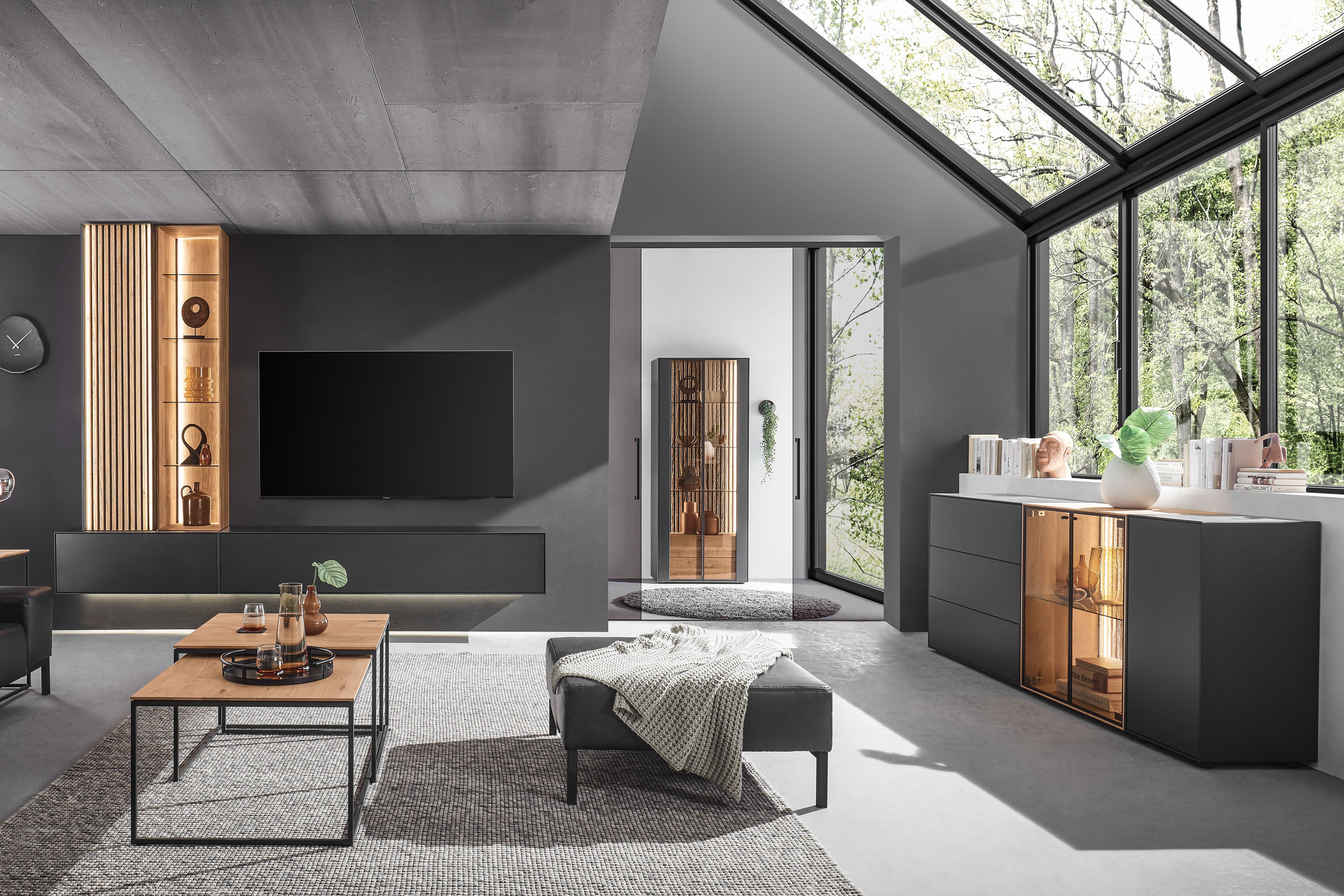Wohnwand von Hartmann - Modell Selino V26 Kerneiche natur/ Birke anthrazit Selino - Naturschauspiel aus Massivholz und Lack