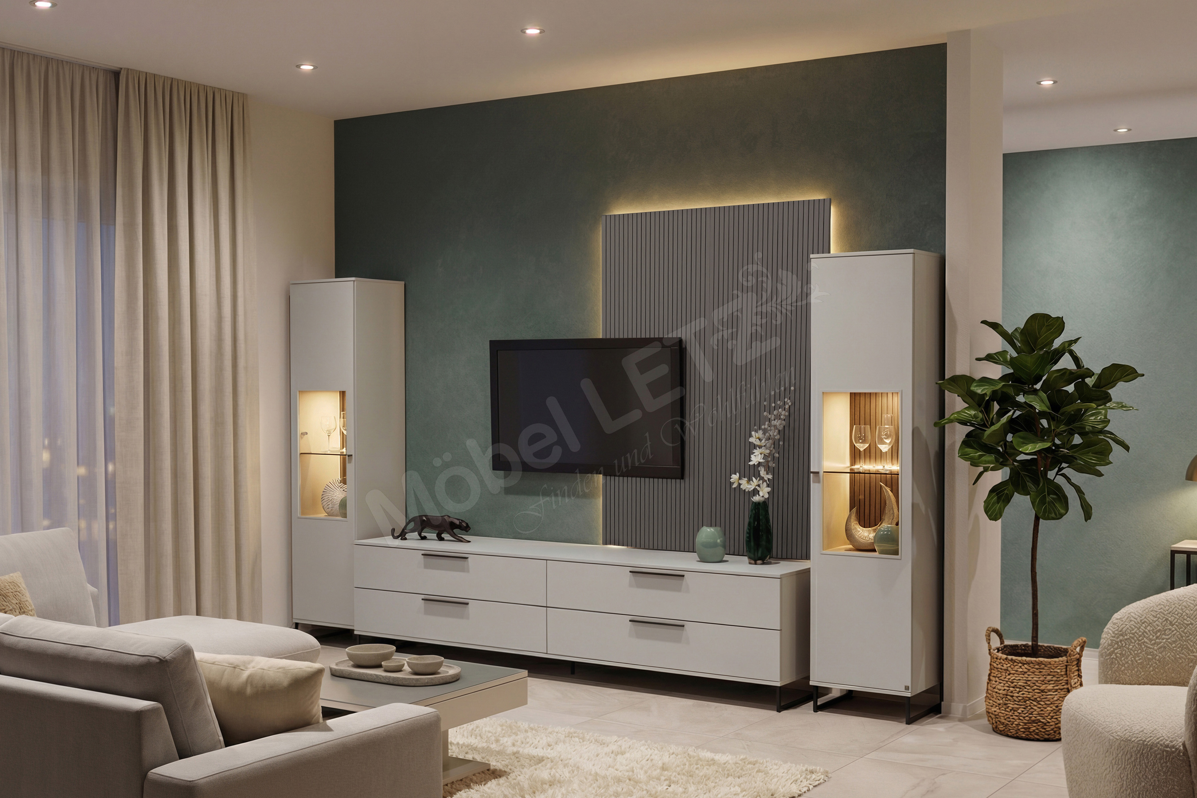 Nicht nur exklusiv, sondern ebenso zauberhaft präsentiert sich diese Wohnwand Kara-System von Musterring. Die durchdachte Kombination setzt sich aus zwei Vitrinen, einem Lowboard sowie einem ausdrucksstarken Wandpaneel mit Feinschliff zusammen und entfaltet in jedem Wohnraum ihre besondere Wirkung. Eine brillantgraue Ausführung harmoniert stilsicher mit schwarzen Metallelementen und Paneelakzenten mit Deepline, wodurch ein ruhiges, zugleich klar strukturiertes Gesamtbild entsteht, das Behaglichkeit und Modernität vereint. Die beiden Vitrinen verfügen über eine integrierte Beleuchtung, die Ihre Lieblingsstücke wirkungsvoll in Szene setzt und für eine angenehme Atmosphäre sorgt. Hinter den Türen stehen jeweils sechs Fächer zur Verfügung, zwei davon durch einen Glasboden unterteilt und durch einen Klarglasausschnitt einsehbar. Ergänzt wird das Ensemble durch die integrierte indirekte Beleuchtung des Paneels, das dem Arrangement eine stimmungsvolle Lichtkomponente verleiht und die gesamte Gestaltung sanft akzentuiert. Das Lowboard ergänzt die Kombination mit drei voll ausziehbaren Schubkästen sowie einer funktionalen Klappe für verschiedenste Utensilien. Dank Selbsteinzug und Softabstoppung schließen alle Elemente sanft und nahezu geräuschlos, sodass Komfort und Qualität spürbar werden. Mit dem Kara-System von Musterring entscheiden Sie sich für ein stilvolles Wohnkonzept, das Design, Funktionalität und eine harmonische Lichtinszenierung gekonnt miteinander verbindet.